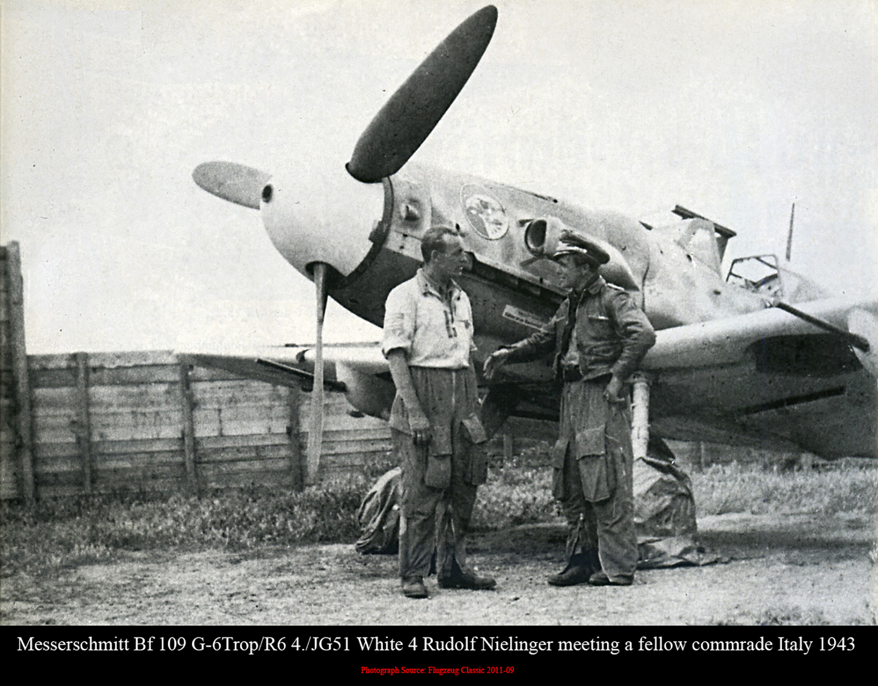 Messerschmitt Bf 109G6R6Trop 4.JG51 White 4 Rudolf Nielinger meeting a fellow commrade Italy 1943 01
