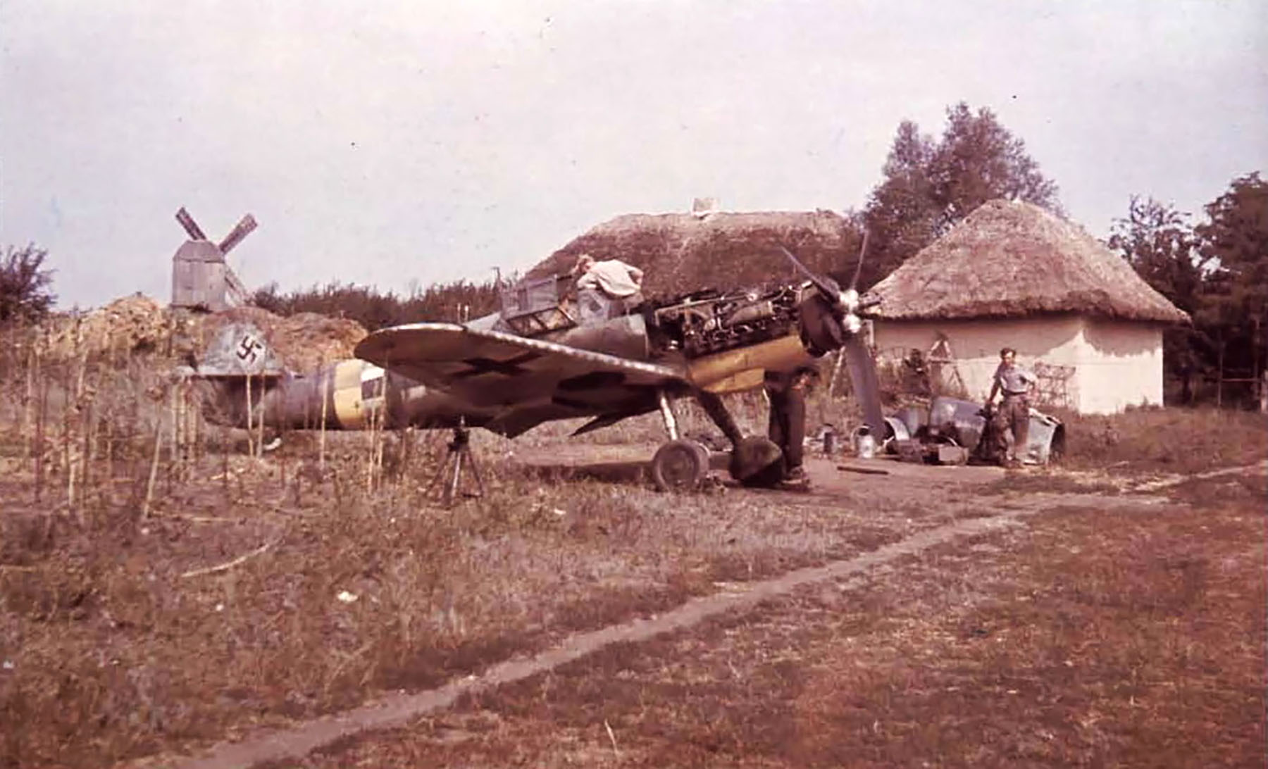Messerschmitt Bf 109G6 1.JG52 under going engine repairs Kharkov Rogan Russia 1943 01