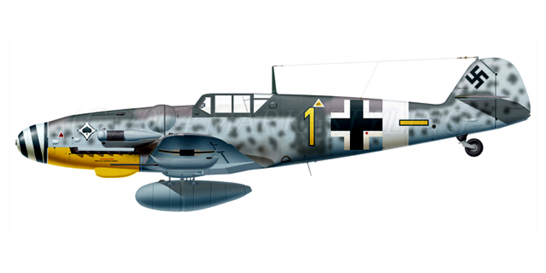 Used in conjunction with the Luftwaffe's other 'star', the Fw 190 which was better-armed and more maneuverable, the Me 109G specialised in high-altitude combat, against the formations of huge Allied four-engined bombers. To increase its performance, various solutions were tried out and installed: more efficient engines of the AS type with power-boost or methanol-water injection giving increased speed for a short time; increasing range by using droptanks; increased firepower (by increasing the nose canon from 20 to 30mm and the machine guns from 13 to 17mm, using rocket launchers or cannon installed in underwing trays), etc.