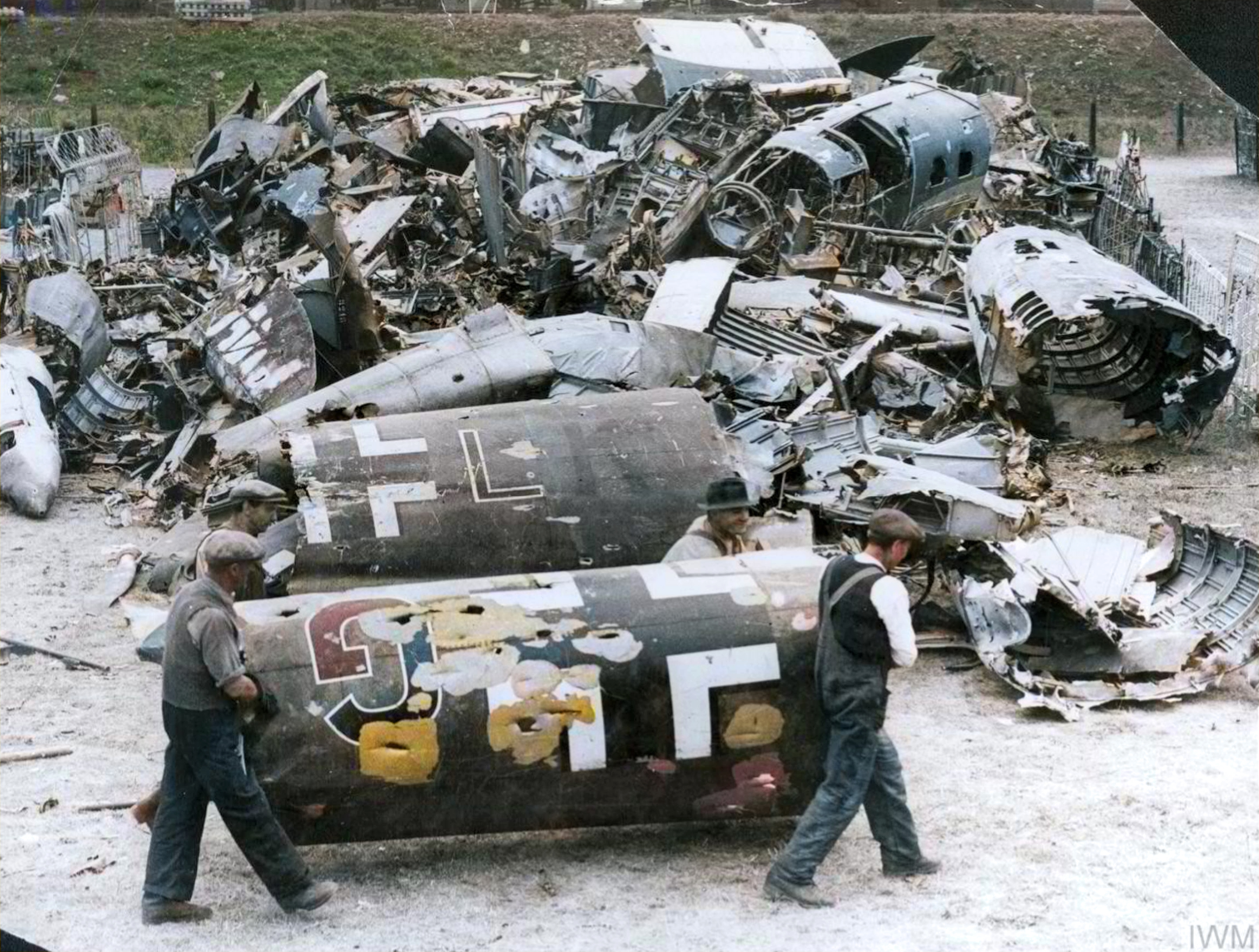 Workmen carry part of a bullet riddled Dornier Do 17 fuselage Battle of Britain Aug 1940 01