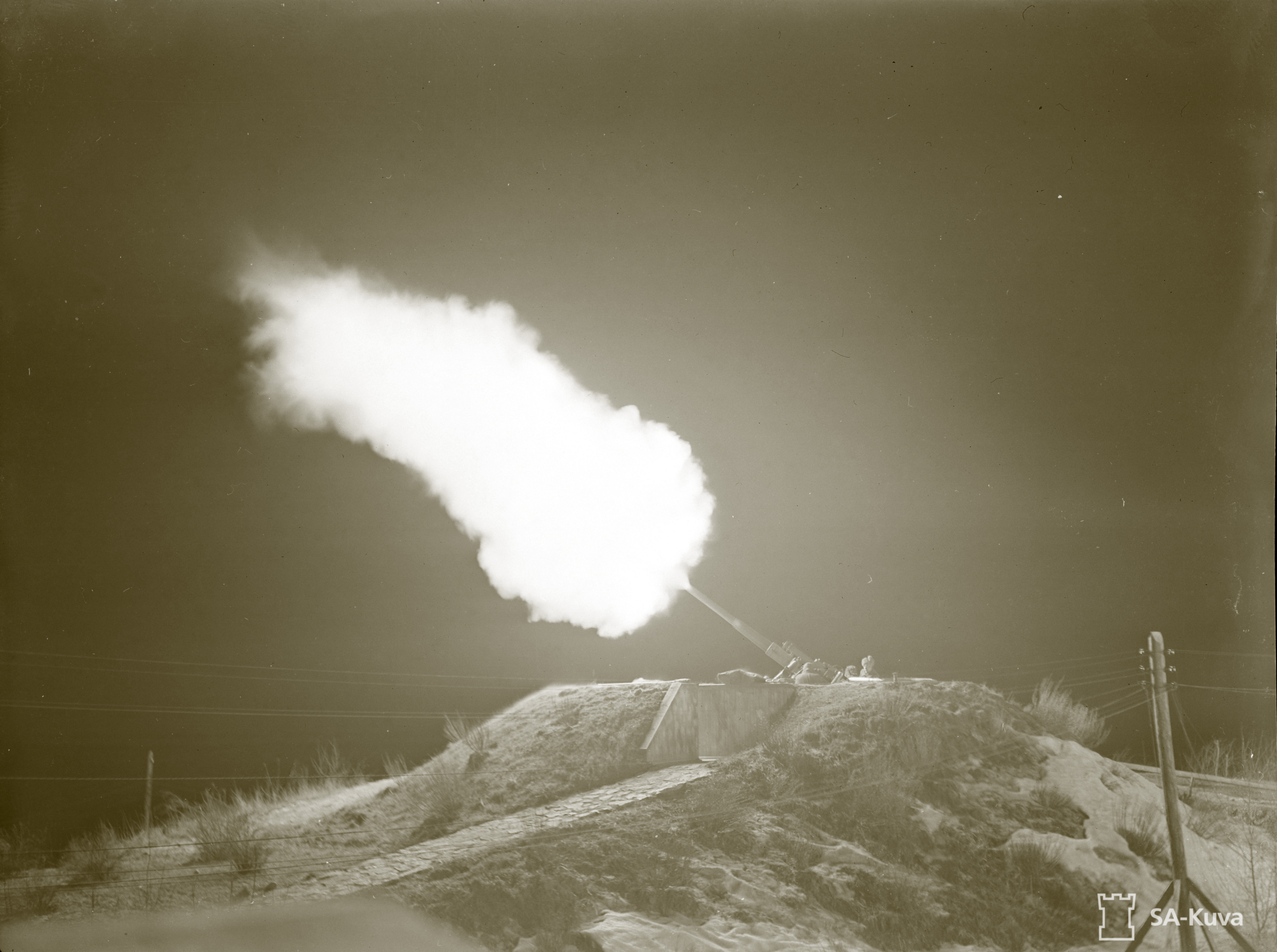 Finnish air defense battery at Taivaskallio firing on Soviet night intruders bombing Helsinki 21st Mar 1943 125485