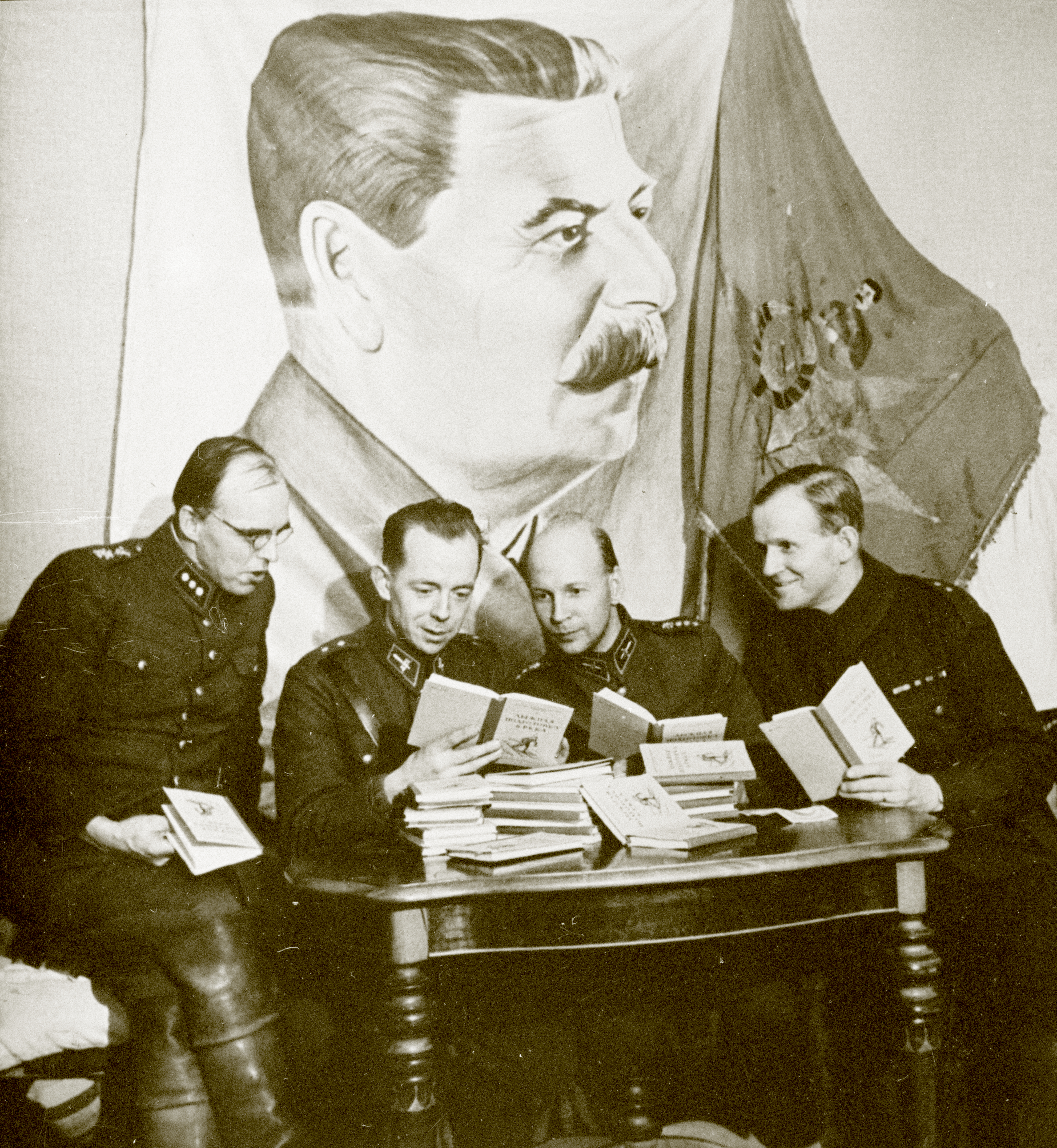 Finnish officers inspecting Soviet skiing manuals gained as loot from the Battle of Suomussalmi 112544