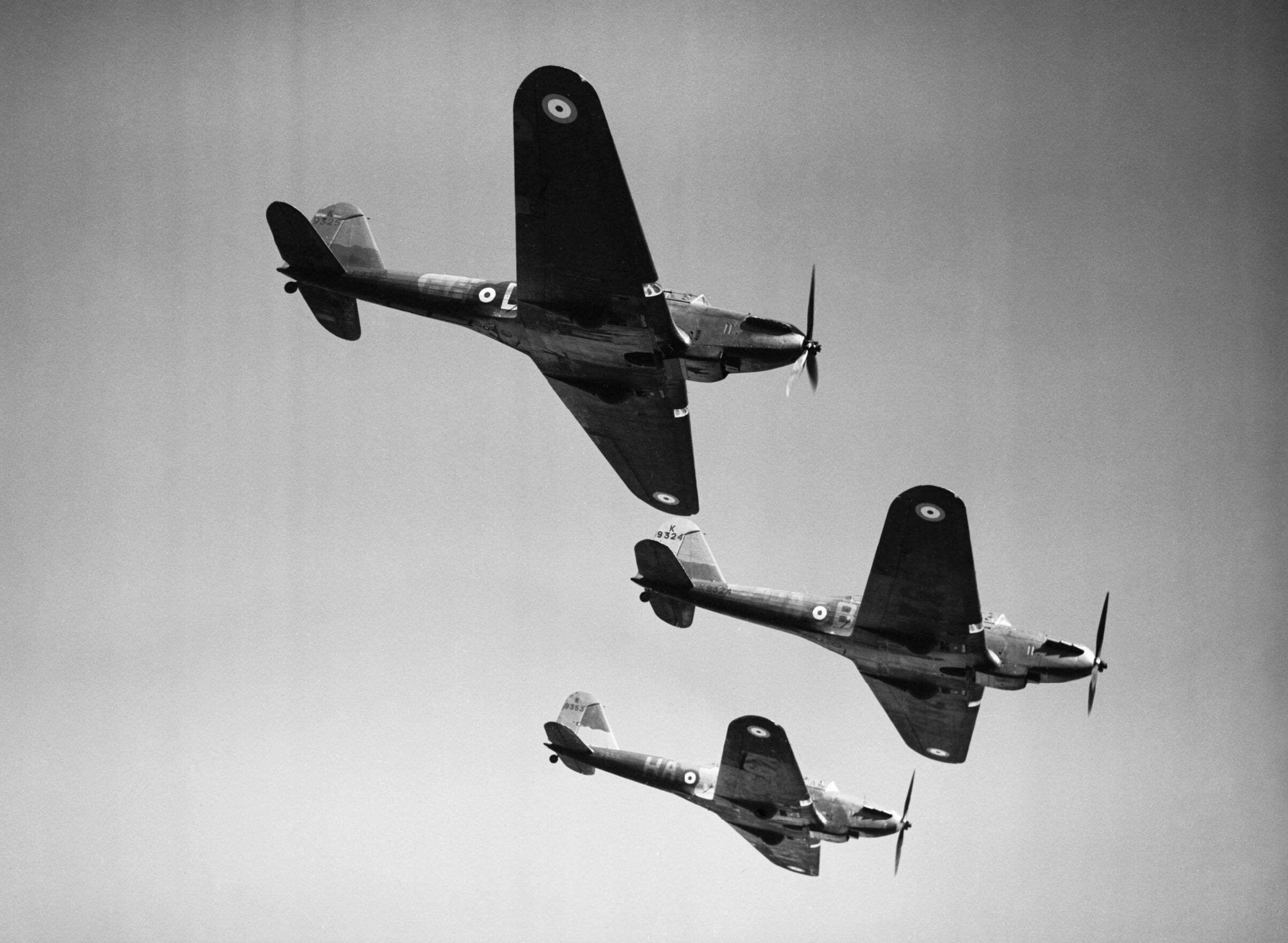 Fairey Battle I RAF 218Sqn HAJ K9353 with HAB K9324 and HAD K9325 over France 1940 IWM C444