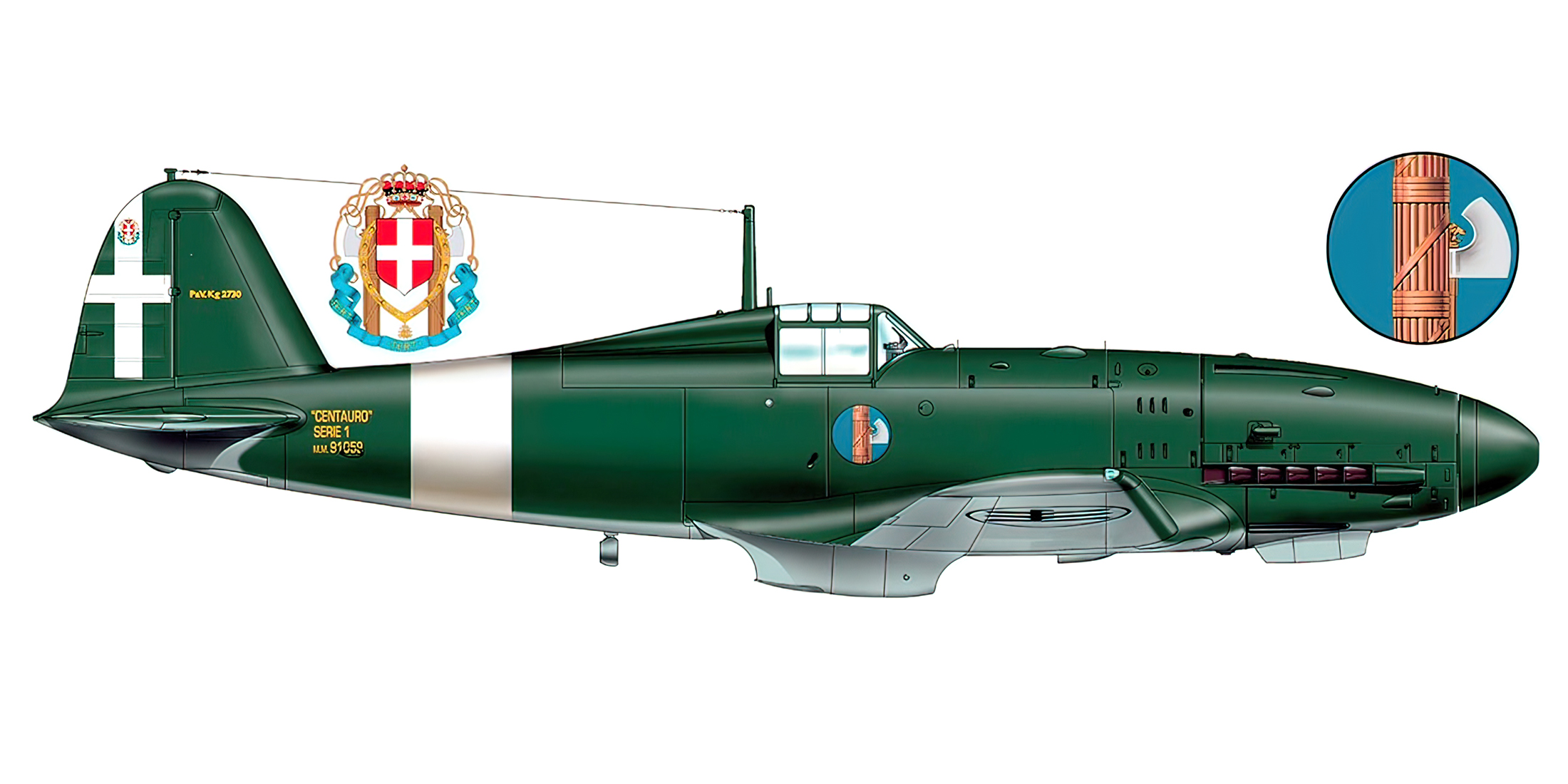 During its short operational service, mostly under the Repubblica Sociale Italiana insignia, after the 8 September 1943 armistice, this powerful, robust and fast aircraft proved itself to be an excellent interceptor at high altitude. In 1944, over Northern Italy, the Centauro clashed with British Supermarine Spitfire, P-51 Mustang, P-47 Thunderbolt and P-38 Lightning, proving to be no easy adversary. [4] Italian fighter pilots liked their Centauro but by the time the war ended, fewer than 300 had been built. [2] (This is in comparison with, for example, the 34,000 Bf 109s built by the Germans.)