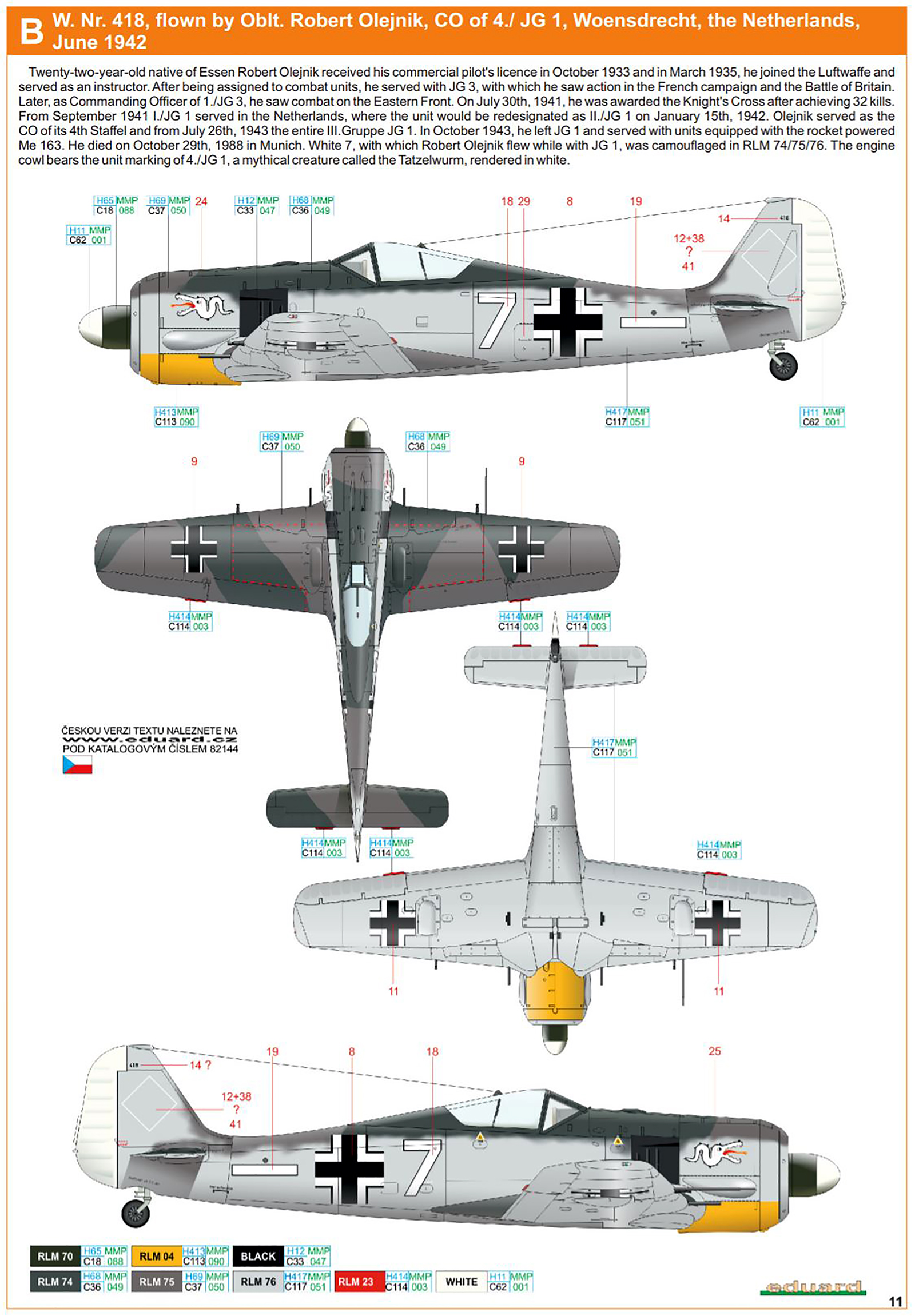 Focke Wulf Fw 190A3 4.JG1 White 7 Robert Olejnik WNr 418 Woensdrecht Netherlands June 1942-0B