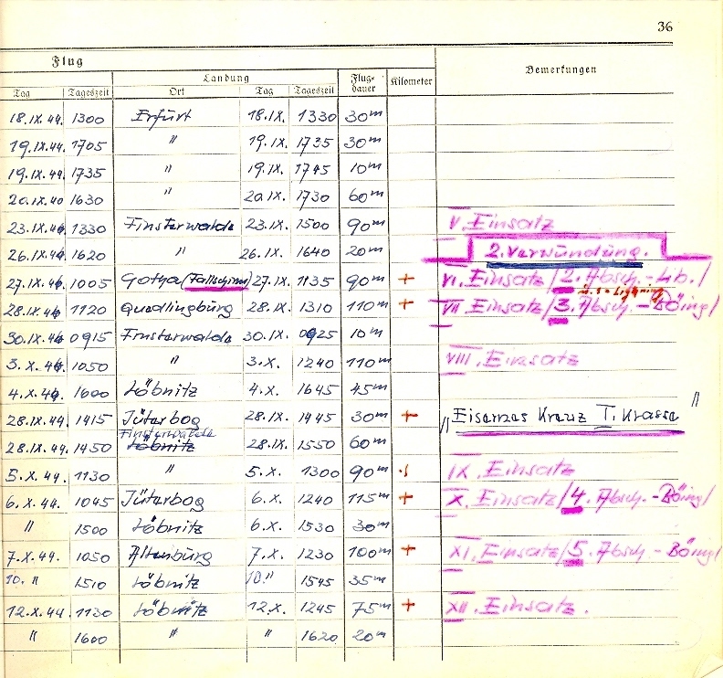 Aircrew Luftwaffe Norbert Graziadei pilots log book entries Sep Oct 1944-page 36 01