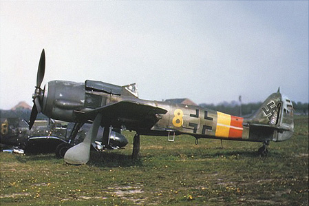 The Focke-Wulf Fw 190 Würger (English: Shrike) named after a bird is a German single-seat, single-engine fighter aircraft designed by Kurt Tank in the late 1930s and widely used during World War II. Along with its well-known counterpart, the Messerschmitt Bf 109, the Fw 190 became the backbone of the Luftwaffe's Jagdwaffe (Fighter Force). The twin-row BMW 801 radial engine that powered most operational versions enabled the Fw 190 to lift larger loads than the Bf 109, allowing its use as a day fighter, fighter-bomber, ground-attack aircraft and, to a lesser degree, night fighter.