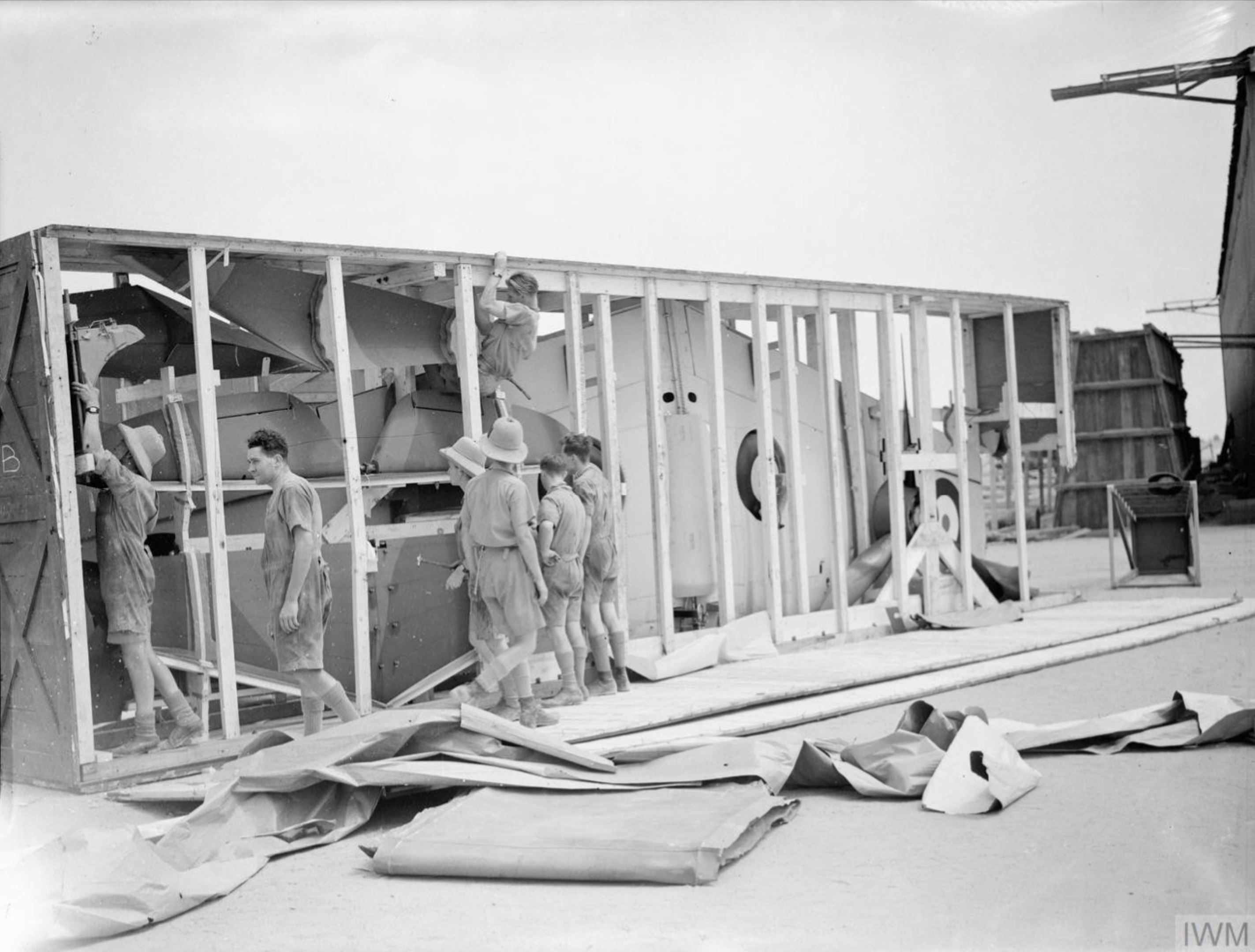 Curtiss Tomahawk IIb RAF 107MU RAF Fitters uncrate the wing and tailplane sections at Kasfareet Egypt IWM CM1096