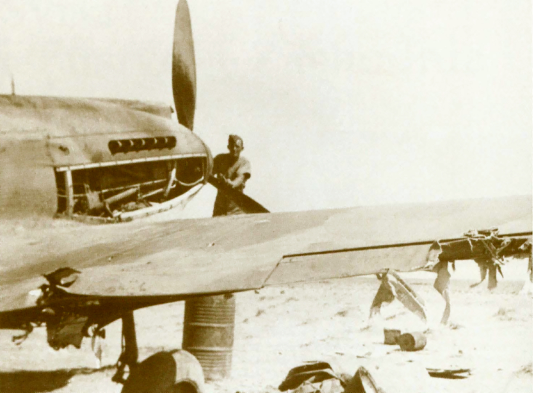 Curtiss Tomahawk RAF 250Sqn Caldwell AK493 damaged after combat 1.JG27 Werner Schroer at Sidi Haneish Aug 1941 IWM