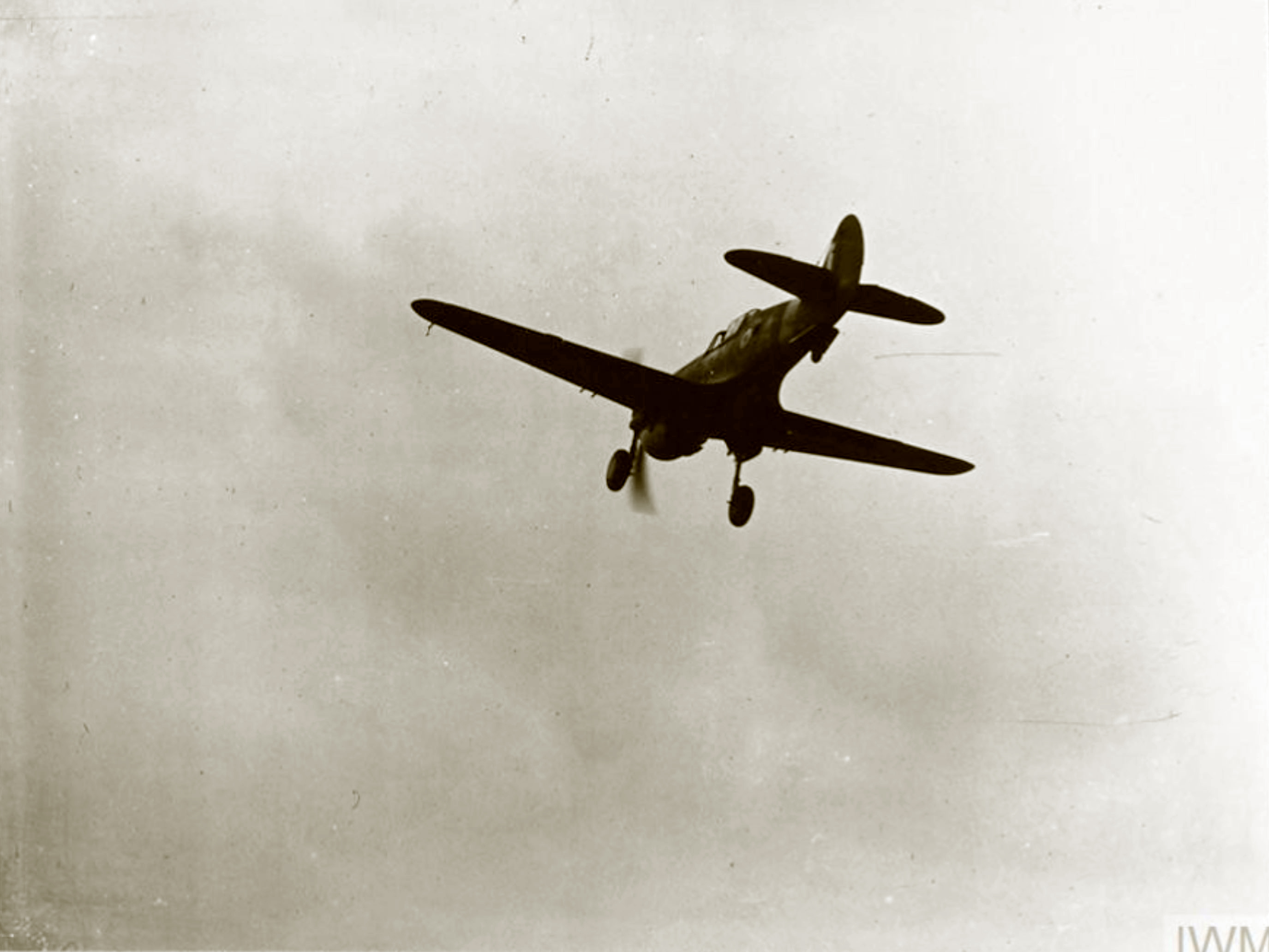 Curtiss Tomahawk RAF 26Sqn RMA silhouetted as it comes in for landing at Gatwick Sussex IWM CH5866