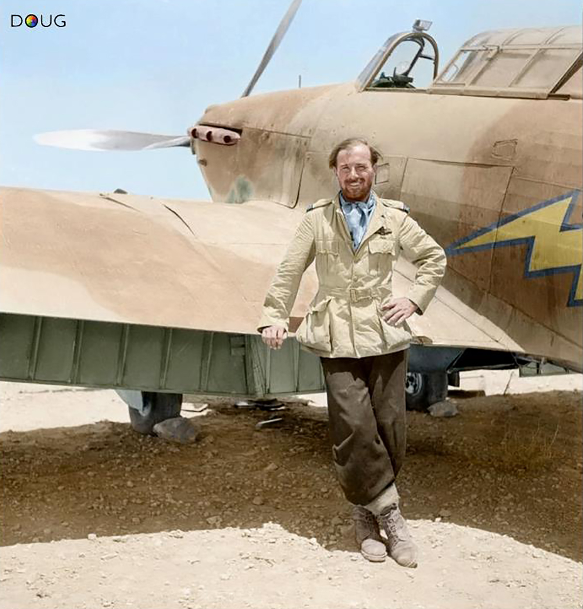 Aircrew RAF 274Sqn FlLt Dudley SG Honor poses by a Hurricane at Gerawala Egypt 01