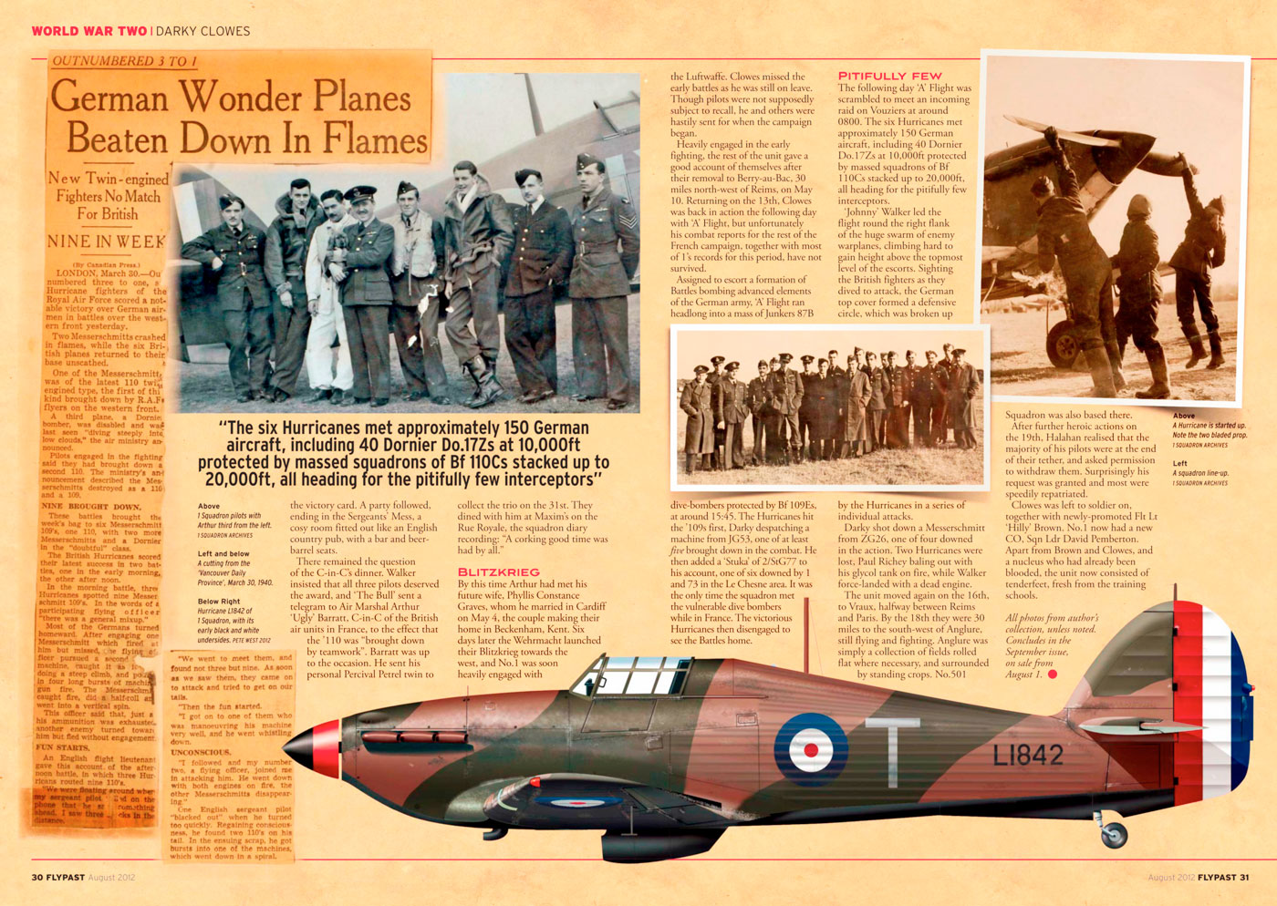 After his first flight in October 1939, Beamont subsequently flew operationally with 87 Squadron, claiming three enemy aircraft during the French campaign, and delivered great praise of his aircraft's performance:'Throughout the bad days of 1940, 87 Sqn had maintained a proficient formation aerobatic team, the precise flying controls and responsive engines permitting precision formation through loops, barrel rolls, 1g semi-stall turns and rolls off half-loops...My Hurricane was never hit in the Battles of France and Britain, and in over 700 hr on type I never experienced an engine failure."