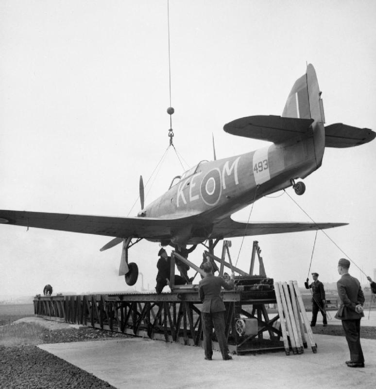 MSFU Sea Hurricane I KEM Z4936 being lowered onto a training catapult at Liverpool IWM 01