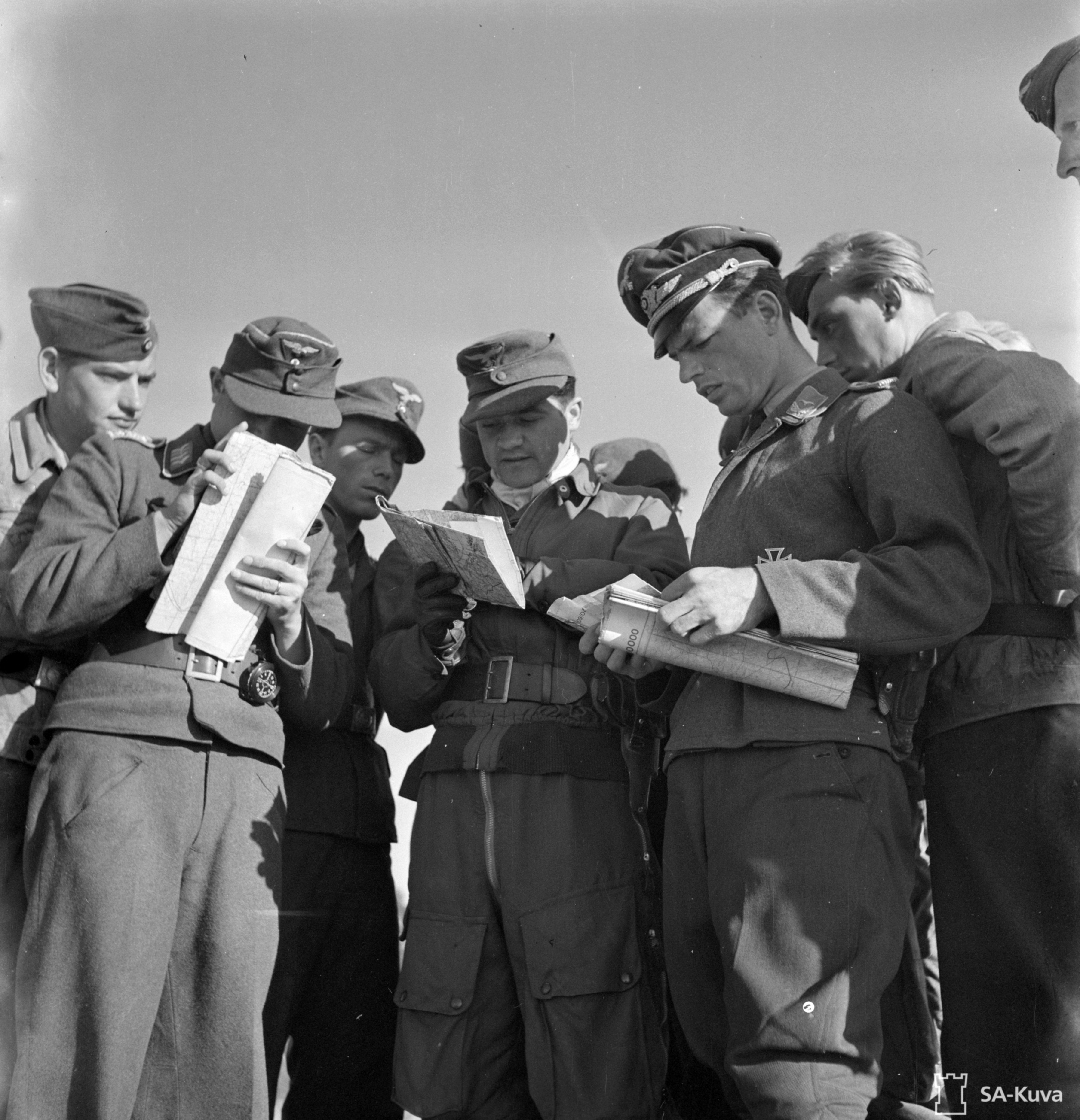 Aircrew Luftwaffe SG3 pilots study their maps at Immola for their next mission 2nd Jul 1944 03