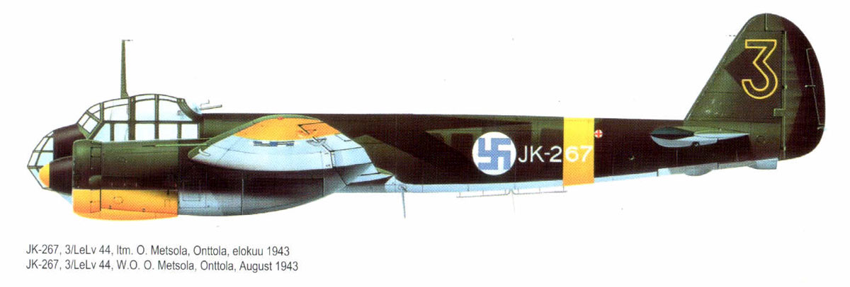 Certainly the most versatile German warplane of World War II, the Junkers Ju 88 in progressively improved versions continued in production throughout the war. It was originated to meet a requirement for a three-seat high-speed bomber and the first prototype, powered by two 746kW Daimler-Benz DB 600Aa engines, made its initial flight on 21 December 1936. Further prototypes followed, the third with 746kW Junkers Jumo engines and this, during evaluation, attained a speed of 520km/h. Such high performance encouraged record-breaking attempts, and in March 1939 the fifth prototype set a 1,000km closed-circuit record of 517km/h carrying a 2000kg payload. A total of 10 prototypes was completed, and the first of the pre-production Ju 88A-0 bombers flew in early 1939, the initial Ju 88A-1 production version entering service in September 1939.
