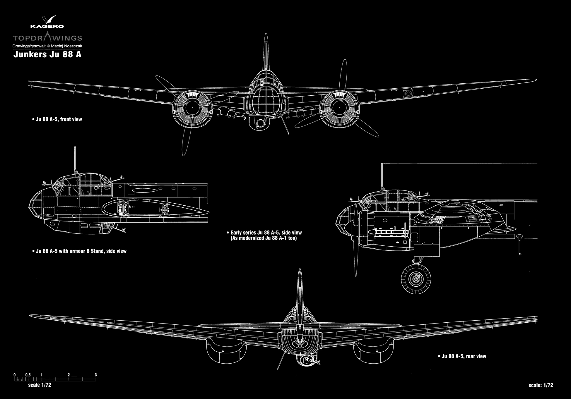 Artwork by Kagero blue print 1.72 scale Junkers Ju 88 A 5 front and rear view 0A