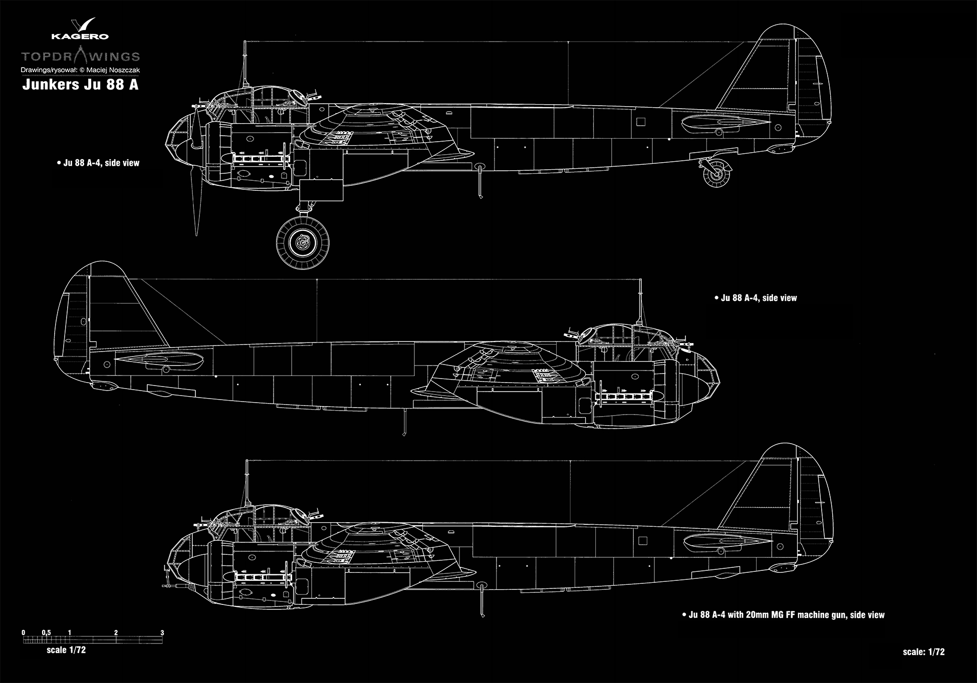 Artwork by Kagero blue print 1.72 scale Junkers Ju 88 A 6 and A 4 with 20mm MG FF side view 0A