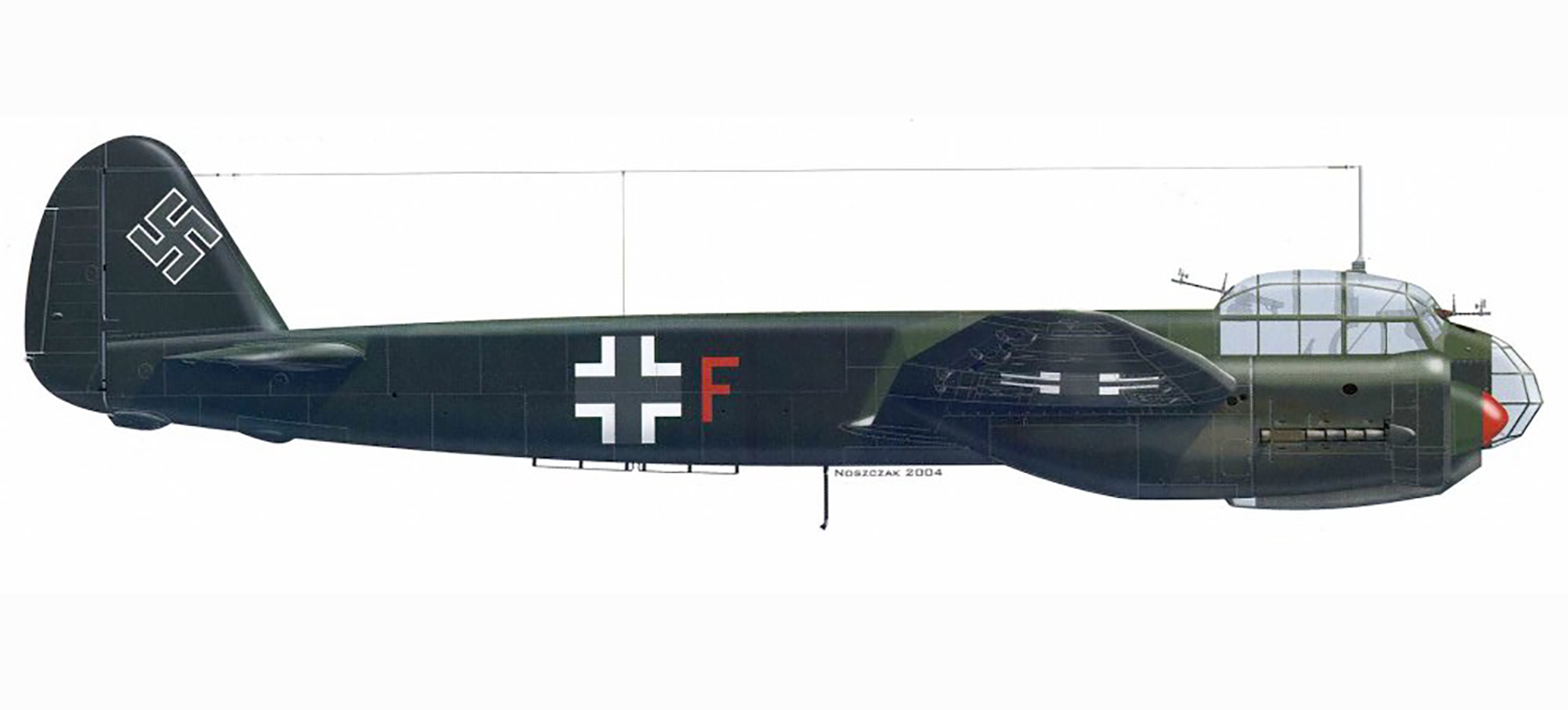 Certainly the most versatile German warplane of World War II, the Junkers Ju 88 in progressively improved versions continued in production throughout the war. It was originated to meet a requirement for a three-seat high-speed bomber and the first prototype, powered by two 746kW Daimler-Benz DB 600Aa engines, made its initial flight on 21 December 1936. Further prototypes followed, the third with 746kW Junkers Jumo engines and this, during evaluation, attained a speed of 520km/h. Such high performance encouraged record-breaking attempts, and in March 1939 the fifth prototype set a 1,000km closed-circuit record of 517km/h carrying a 2000kg payload. A total of 10 prototypes was completed, and the first of the pre-production Ju 88A-0 bombers flew in early 1939, the initial Ju 88A-1 production version entering service in September 1939.