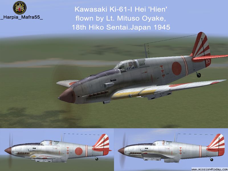 Kawasaki Ki-61 Hien 飛燕 - 'Flying Swallow' National origin:- Japan Role:- Fighter Manufacturer:- Kawasaki Kōkūki Kōgyō K.K. First flight:- December 1941 Introduction:- 1942 Retired:- 1945 (Japan) Primary users:- Imperial Japanese Army Air Service, Chinese Nationalist Air Force, People's Liberation Army Air Force Produced between 1940 - 1945:- 3,078 Variants:- Kawasaki Ki-100 The Kawasaki Ki-61 Hien (飛燕, 'flying swallow') is a Japanese World War II fighter aircraft used by the Imperial Japanese Army Air Service. The Japanese Army designation was 'Army Type 3 Fighter' (三式戦闘機). Allied pilots initially believed Ki-61s were Messerschmitt Bf 109s and later an Italian aircraft, which led to the Allied reporting name of 'Tony', assigned by the United States War Department. It was the only mass-produced Japanese fighter of the war to use a liquid-cooled inline V engine. Over 3,000 Ki-61s were produced. Initial prototypes saw action over Yokohama during the Doolittle Raid on 18 April 1942, and continued to fly combat missions throughout the war.