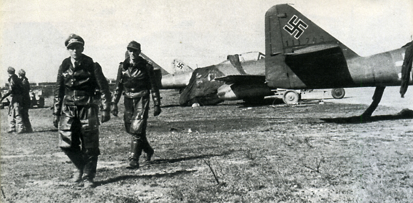 Messerschmitt Me 262A1a JV44 White 5 WNr 111745 and Walter Krupinski background Munich Apr 1945 01