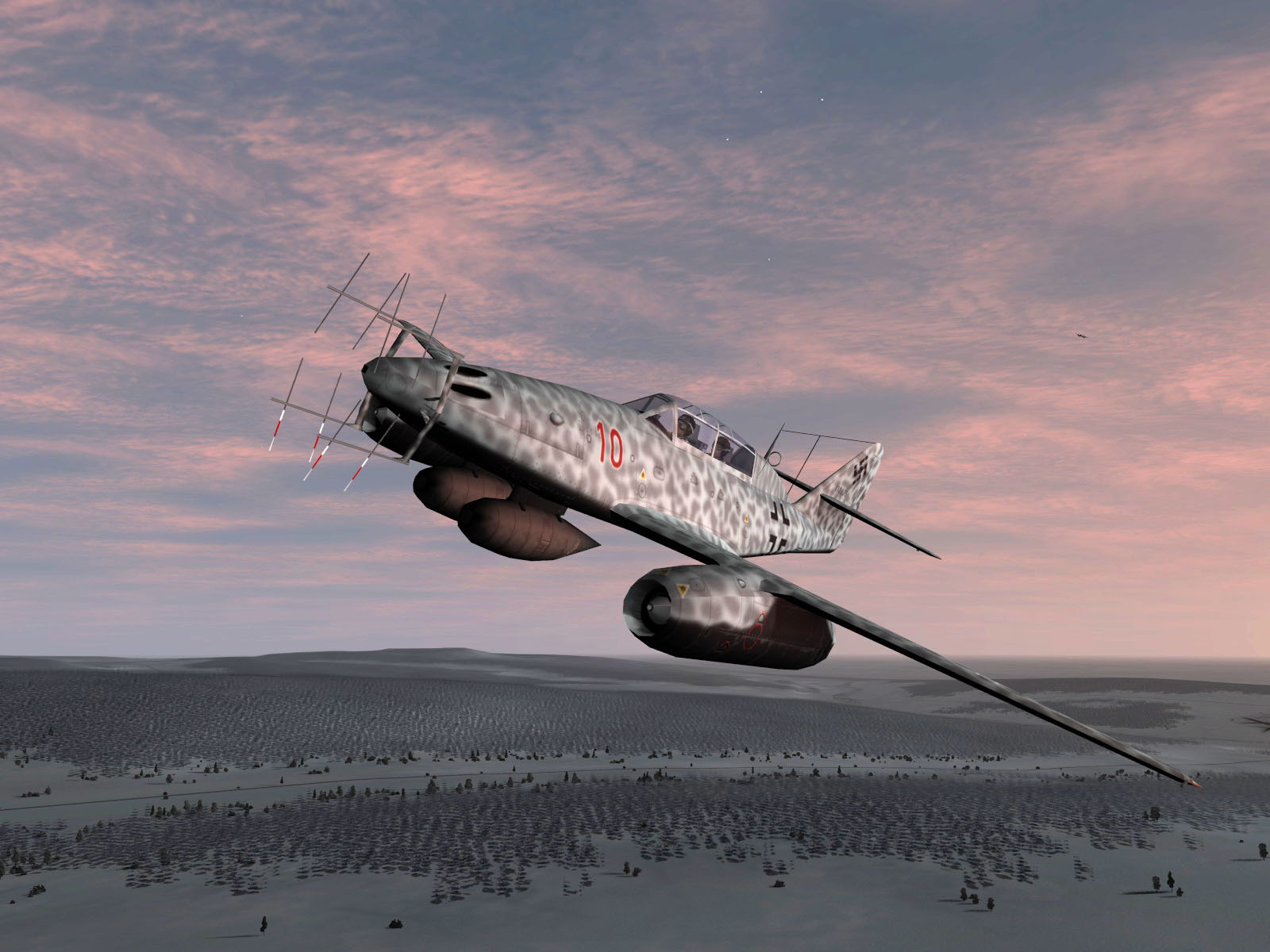 IL2 MH Me 262B 10.NJG11 red 10 low over the winter terrain V07