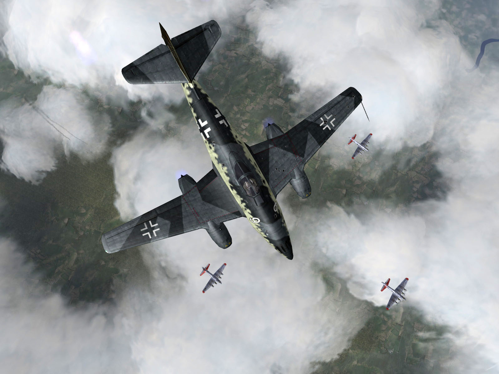 IL2 HD Me 262A Reichsverteidigung White 9 diving on enemy formations V05