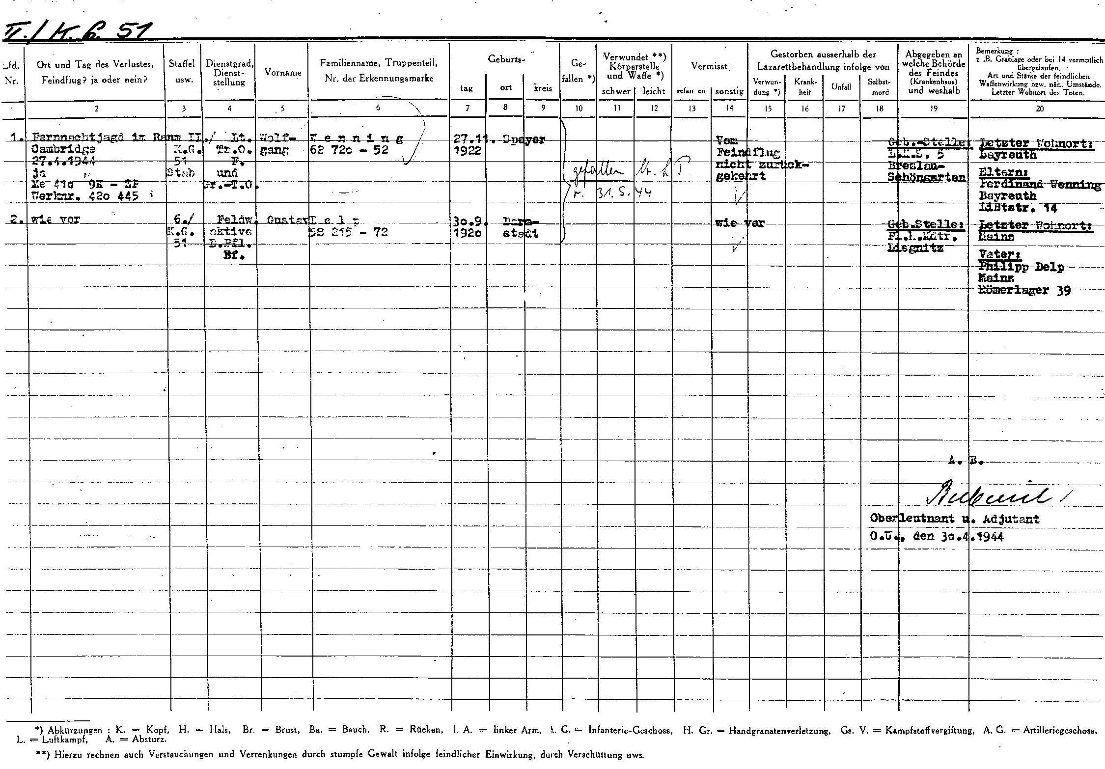 Luftwaffe Lt Wenning Me 410F Loss Card Apr 27 1944 0B