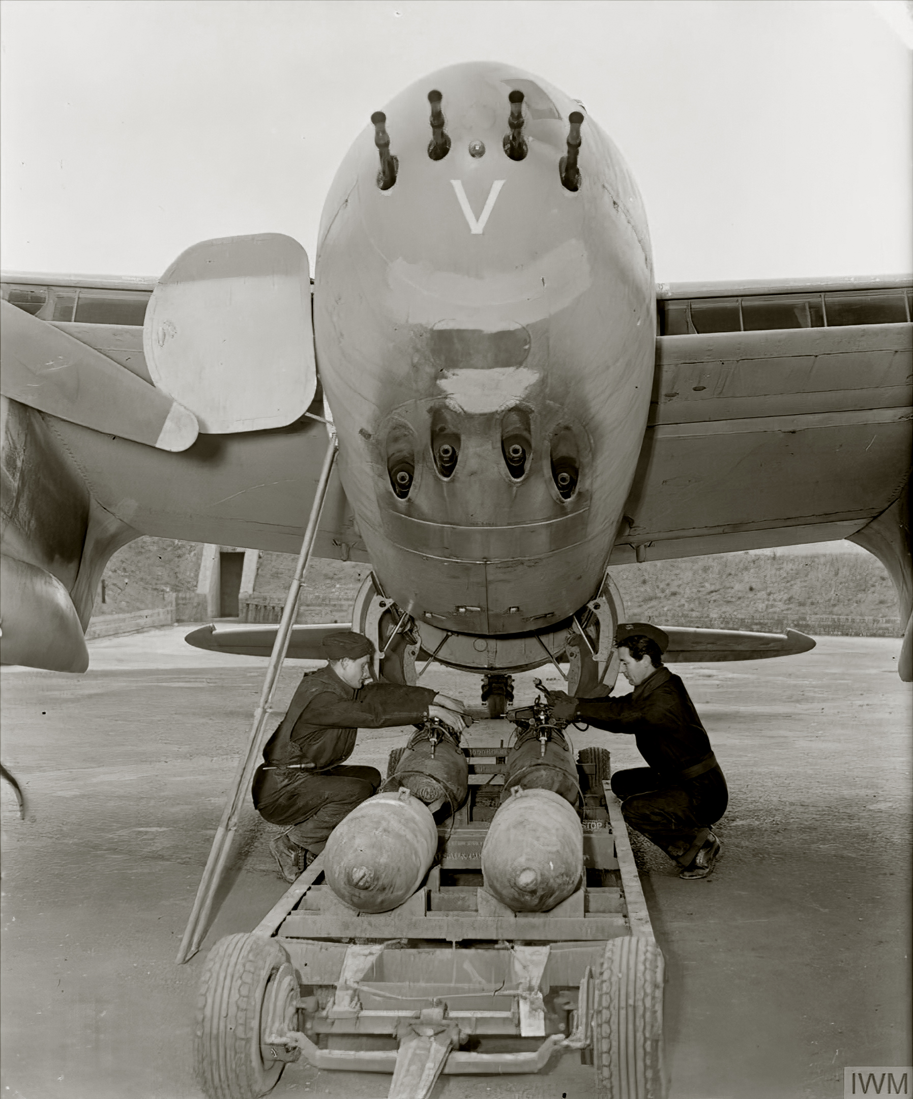 RAAF De Havilland Mosquito FVI 464Sqn SBV MM403 Armourers load four 500 lb MC bombs at Hunsdon Hertfordshire IWM CH12407