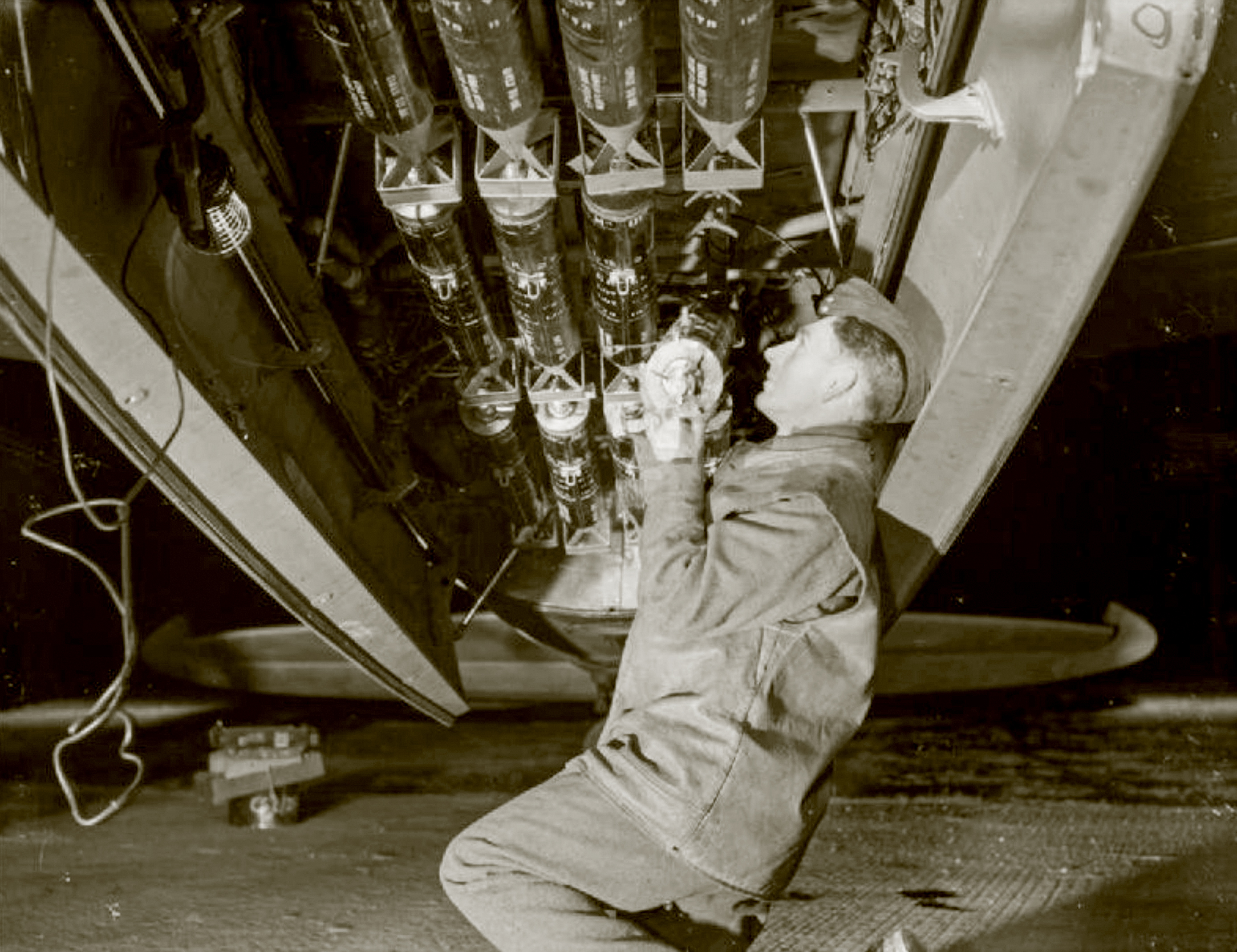 RAF PRXVI Mosquito 140Sqn being loaded with photoflash bombs at B58 Melsbroek Belgium 1944–1945 W01