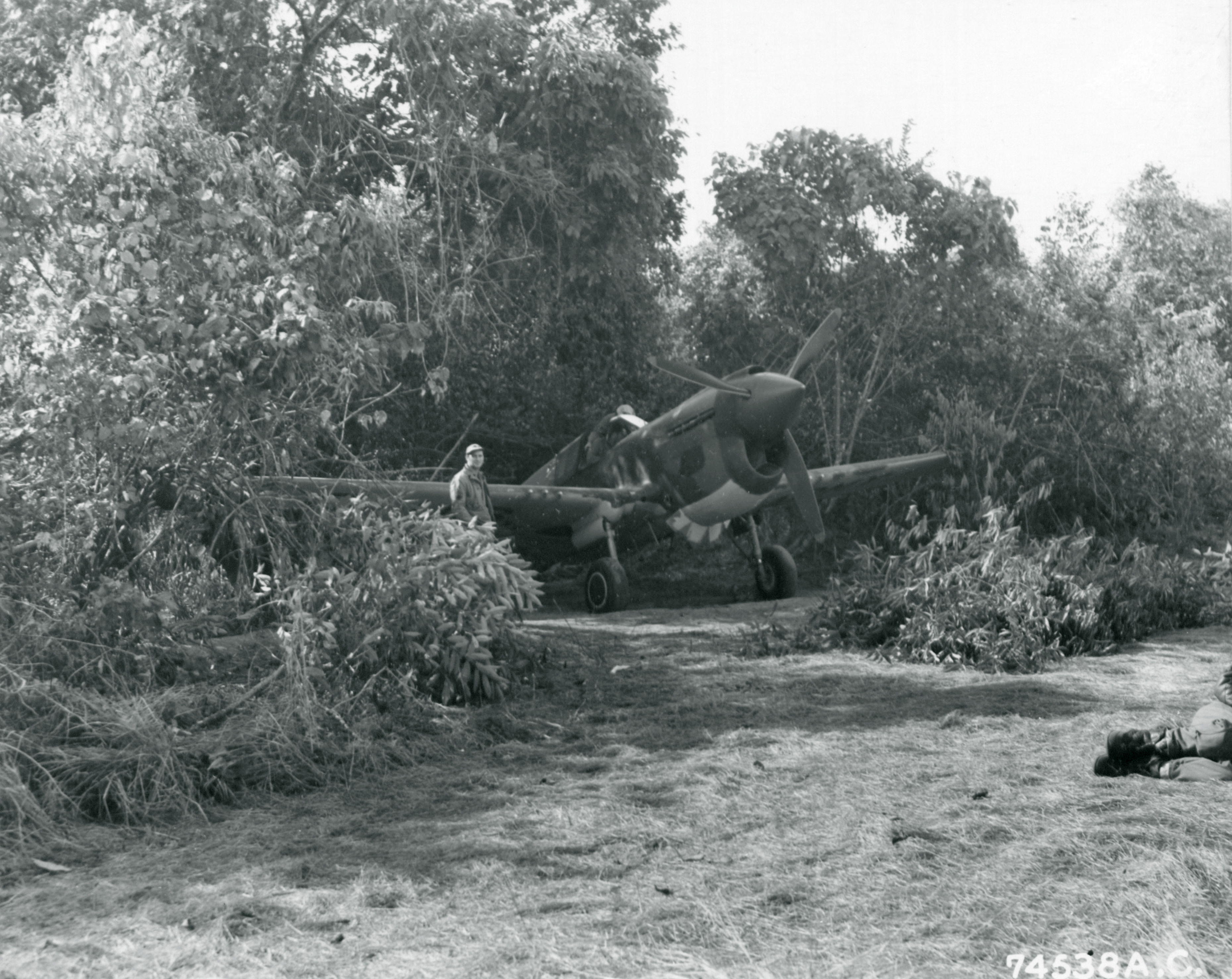Curtiss P 40 Warhawk parked amoung natural camouflage in the dispersal area at Sadiya Assam India NA543