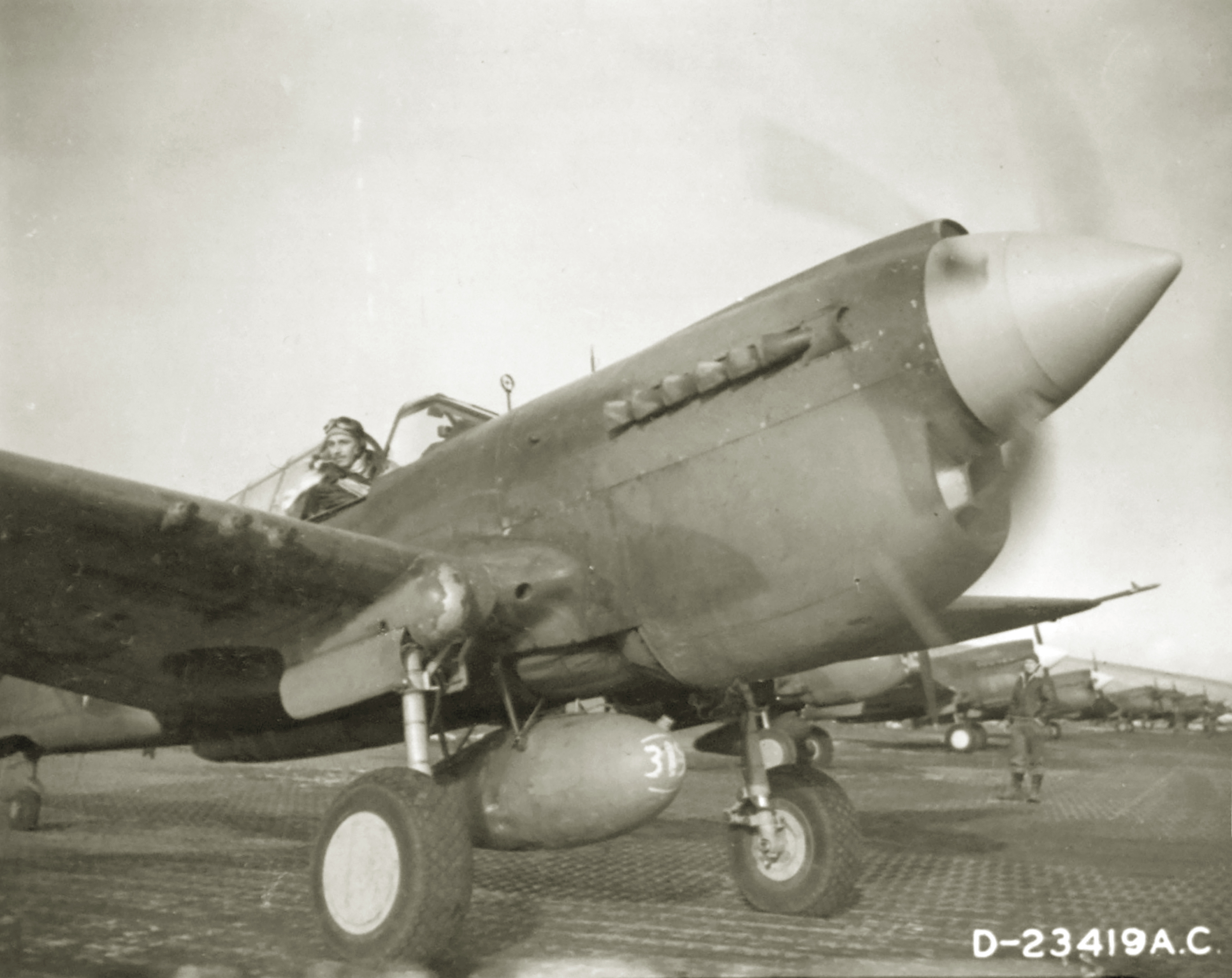 Curtiss P-40E Warhawk 343FG Aleutian Tigers with Lt Bruce K Slonneger prior to take off Aleutian Islands 1943 NA1053