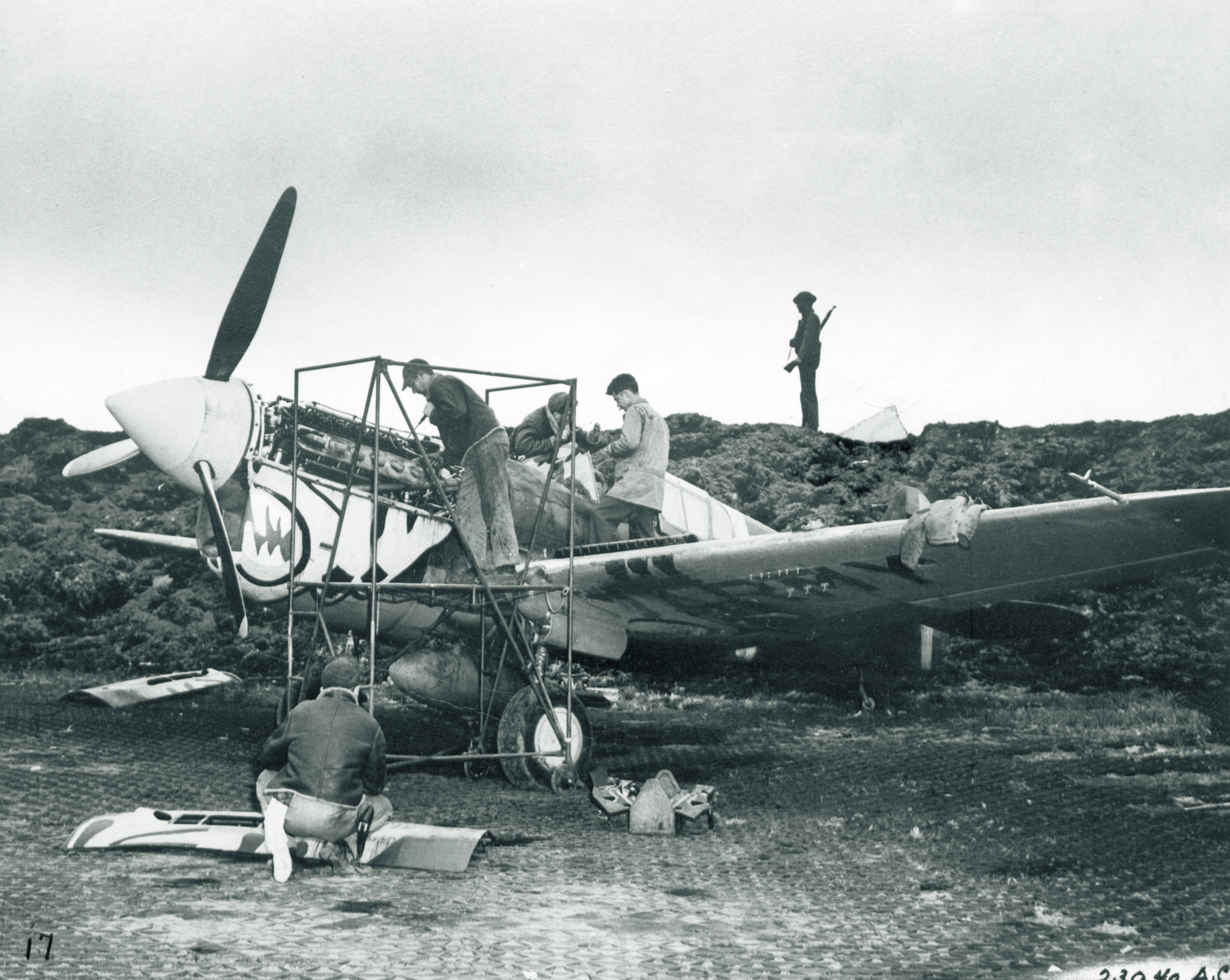Curtiss P-40E Warhawk 343FG11FS Aleutian Tigers under maintenance at Umnak Aleutian Islands 1942 NA140
