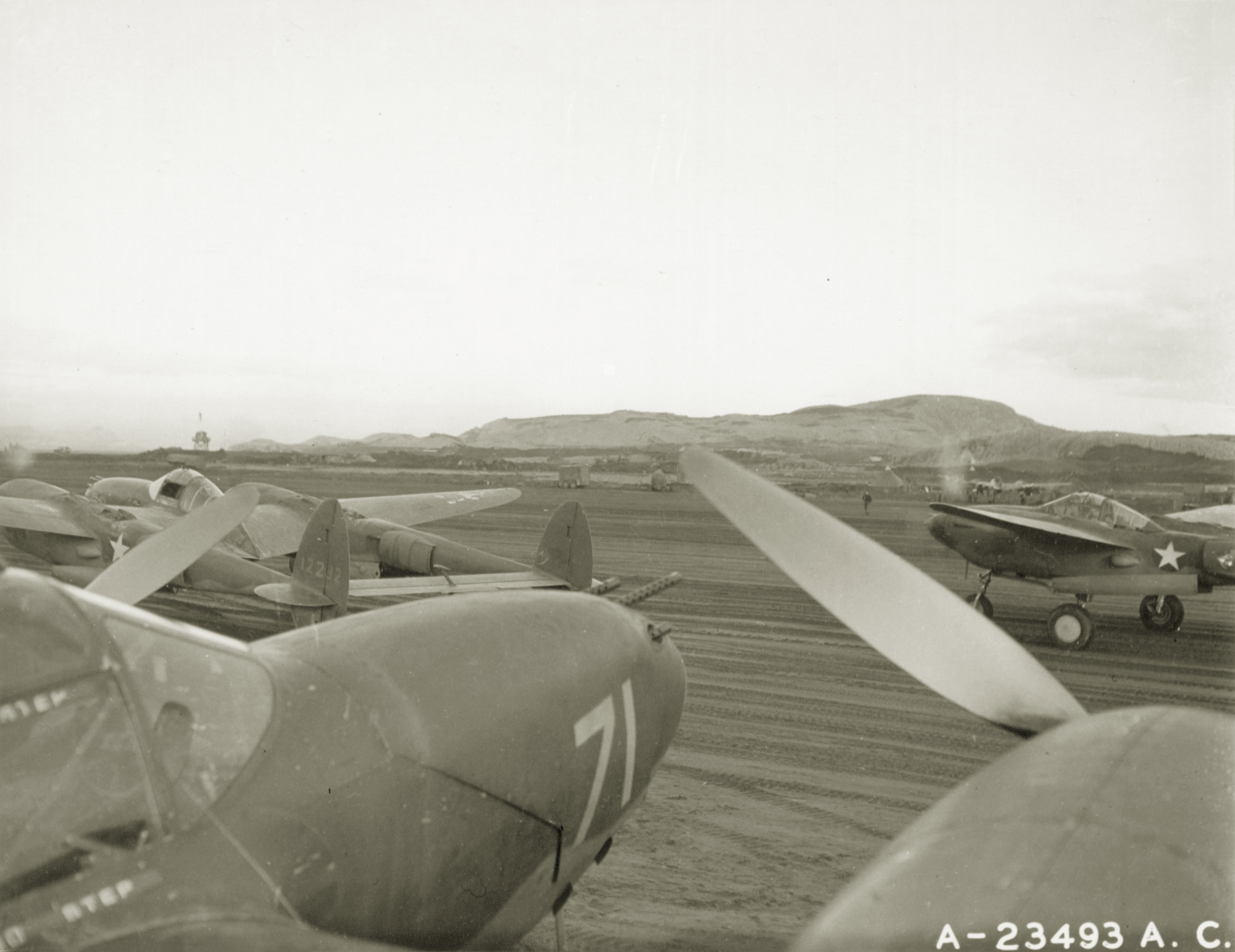 USAAF 41 2292 P 38E Lightnings 343FG54FS taxiing for a raid at Attu Aleutian Islands 1943 NA1102