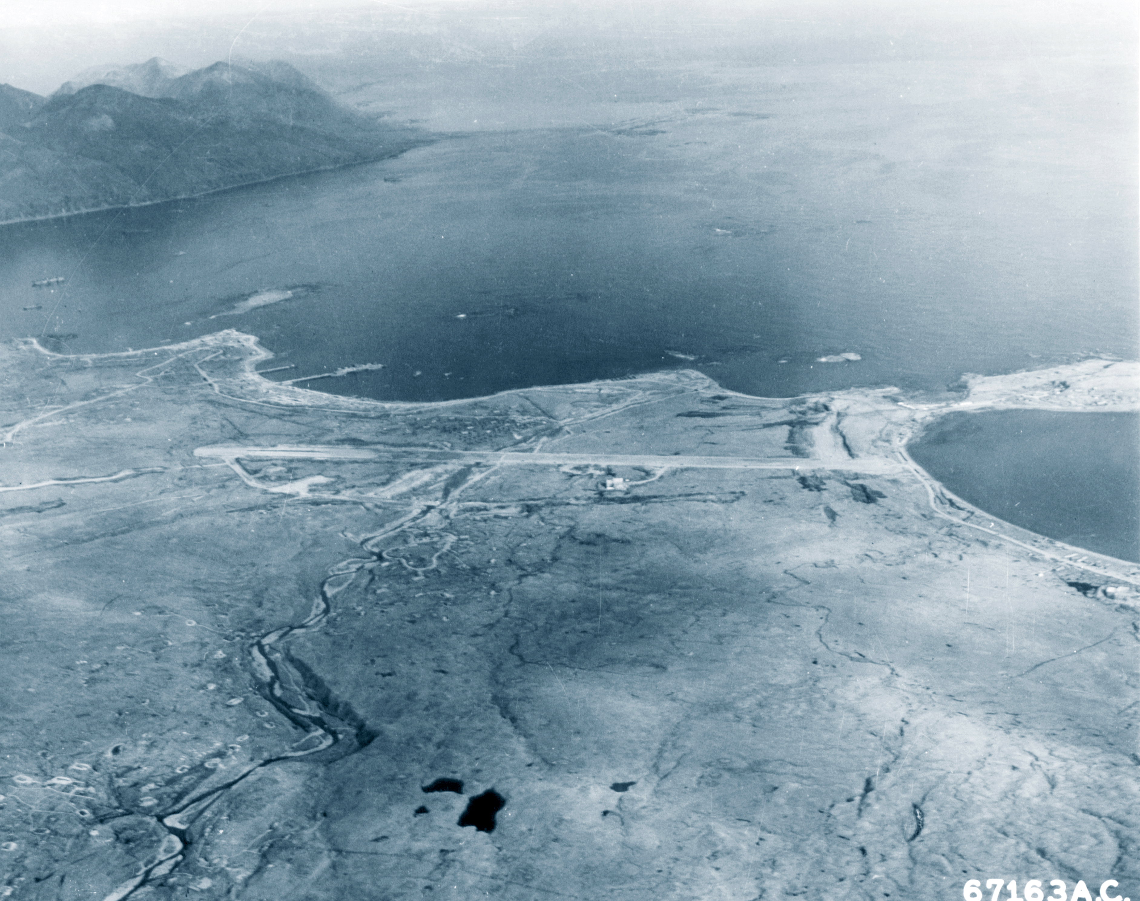 USAAF Casco Naval Airbase Massacre Bay at Attu Aleutian Islands Alaska aerial view at 4,000 ft 20th Sep 1943 NA049