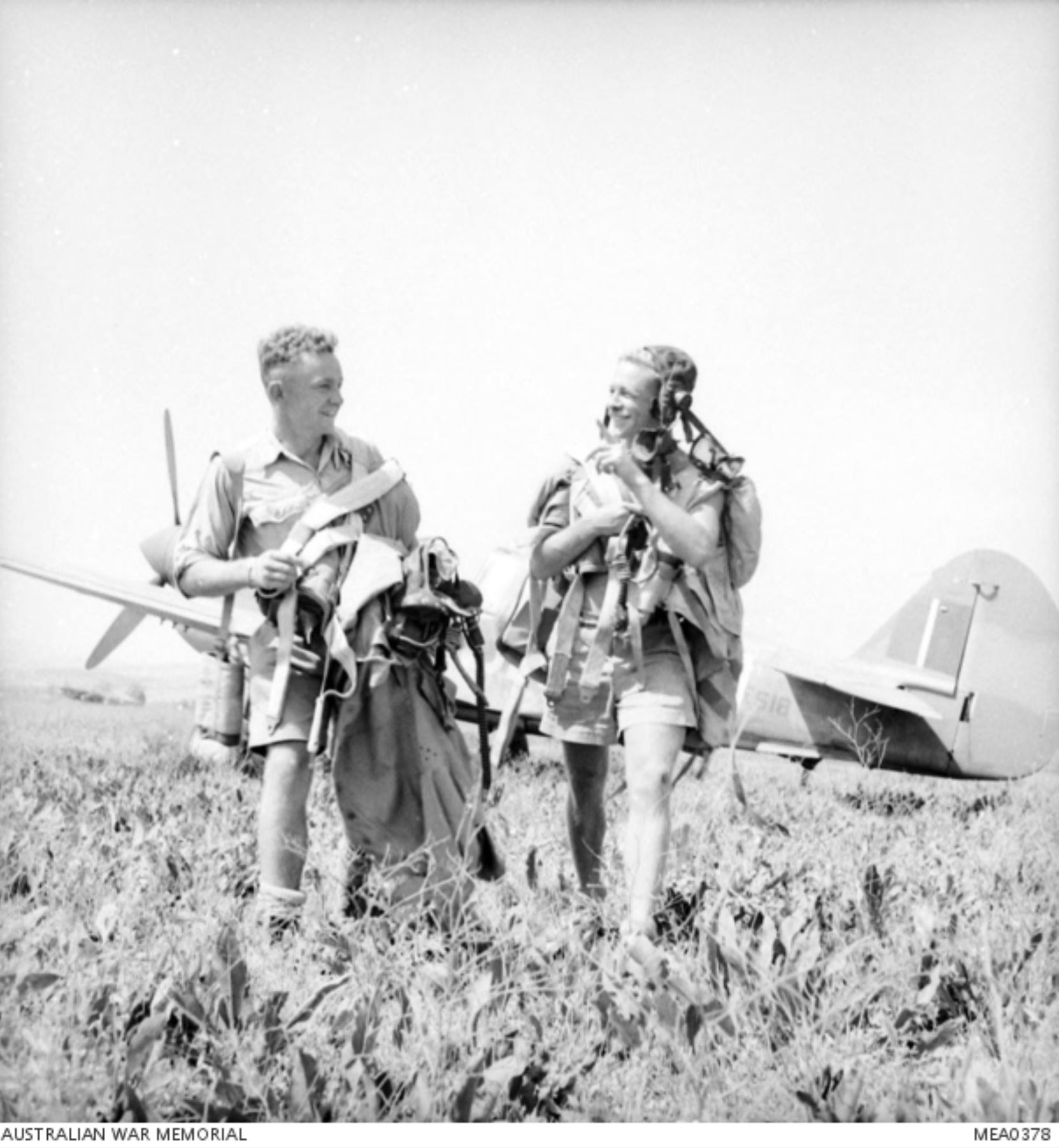 Aircrew RAAF 3Sqn pilots Sgt AT Shannon and Sgt G Mellor at Sicily Italy 1943 AWM MEA0378