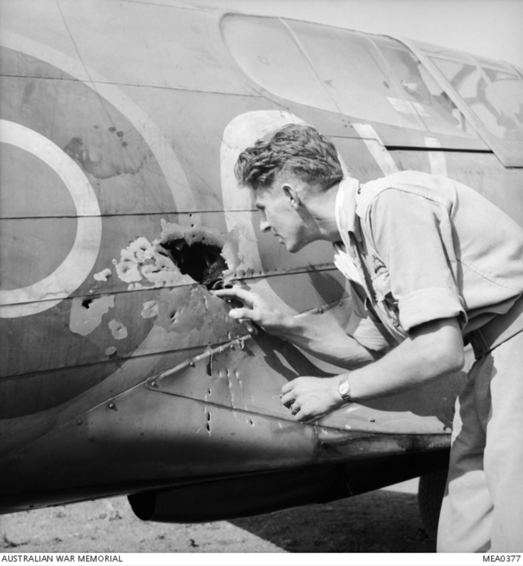 Curtiss P-40 Kittyhawk RAAF 3Sqn WO Douglas Short checks for damage at Sicily Italy 1943 AWM MEA0377
