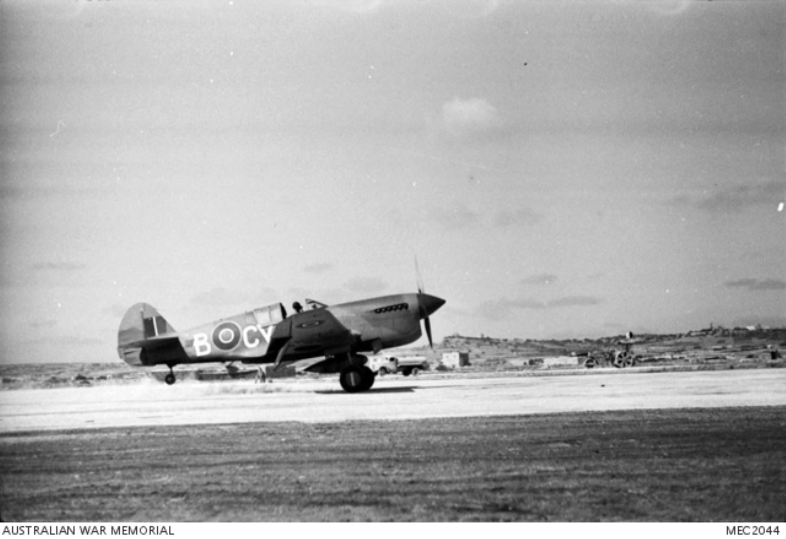 Curtiss P 40F Kittyhawk RAAF 3Sqn CVB taking off for operations over Sicily at Malta Jul 1943 AWM MEC2044