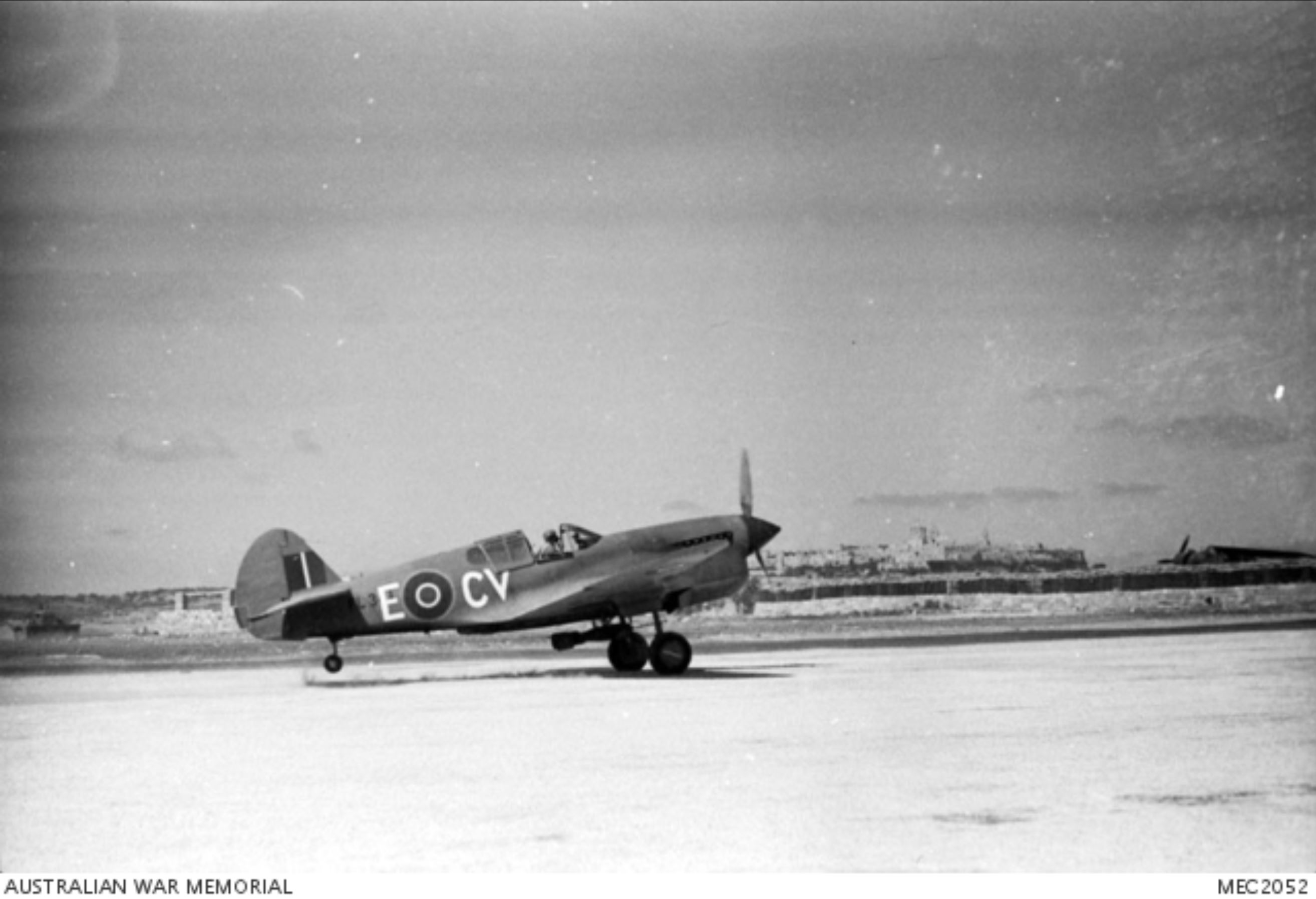 Curtiss P-40F Kittyhawk RAAF 3Sqn CVE FL341 takes off for operations over Sicily July 1943 AWM MEC2052