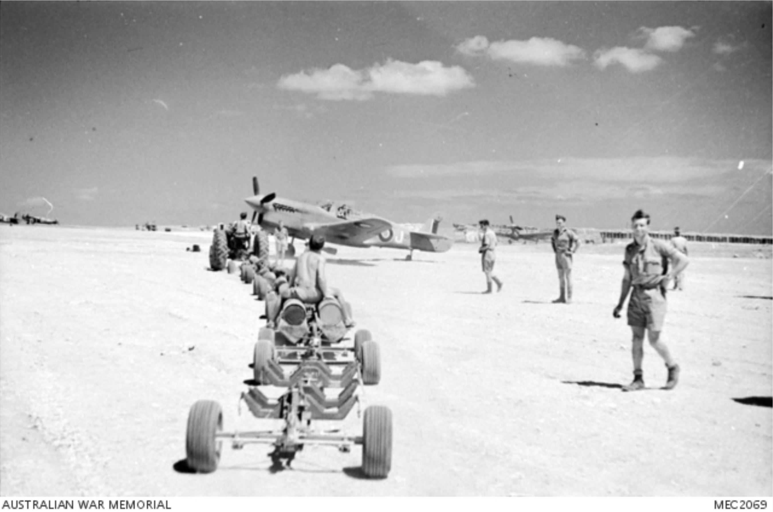 Curtiss P 40F Kittyhawk RAAF 3Sqn CVJ being rearmed at Malta Jul 1943 AWM MEC2069