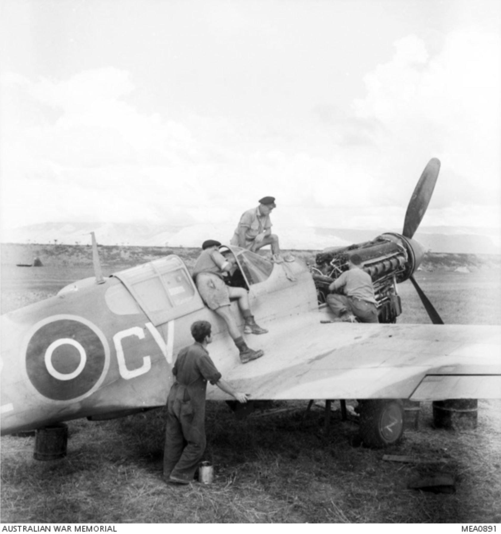Curtiss P-40F Kittyhawk RAAF 3Sqn CVV under maintenance at Mileni Italy Dec 1943 AWM MEA0891