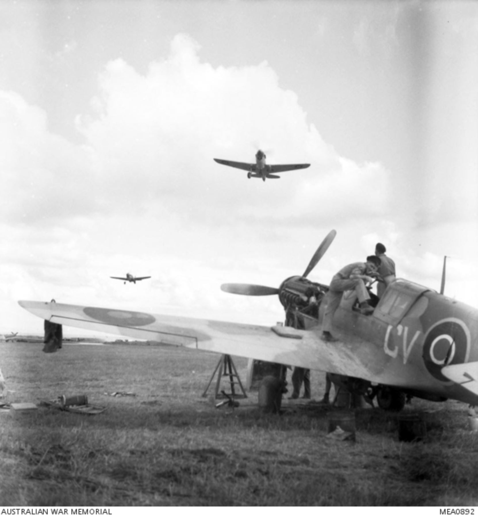 Curtiss P-40F Kittyhawk RAAF 3Sqn CVV under maintenance at Mileni Italy Dec 1943 AWM MEA0892