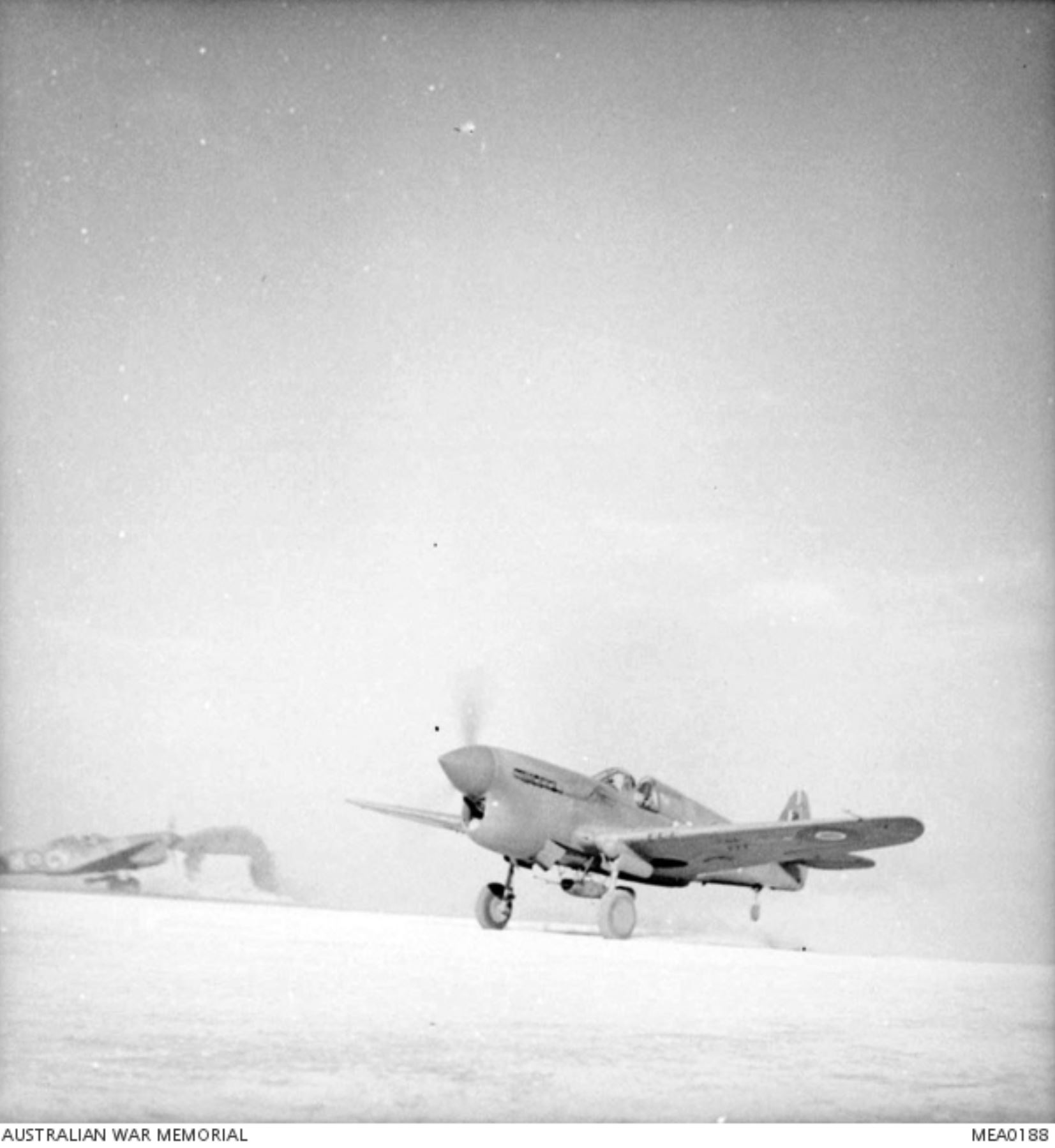 Curtiss P 40F Kittyhawk RAAF 3Sqn CVx taking off from Malta for a raid on Sicily July 1943 AWM MEA0188