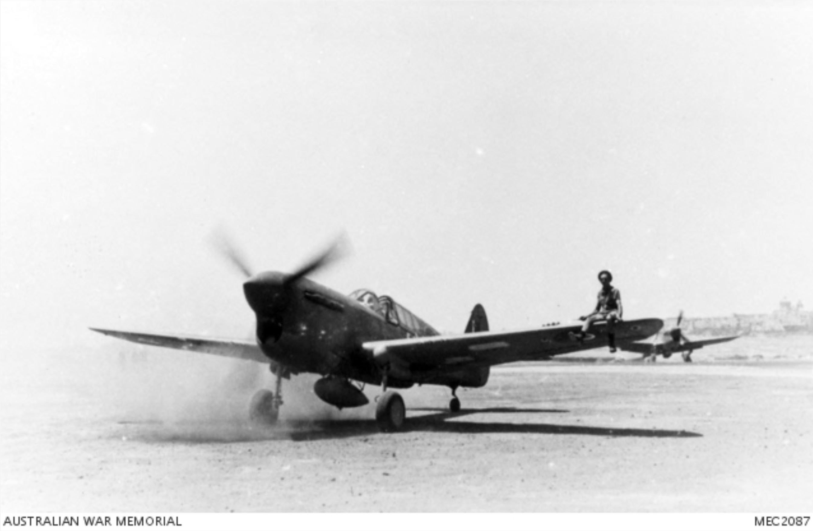 Curtiss P 40F Kittyhawk RAAF 3Sqn taxiing for operations over Sicily at Malta Jul 1943 AWM MEC2087