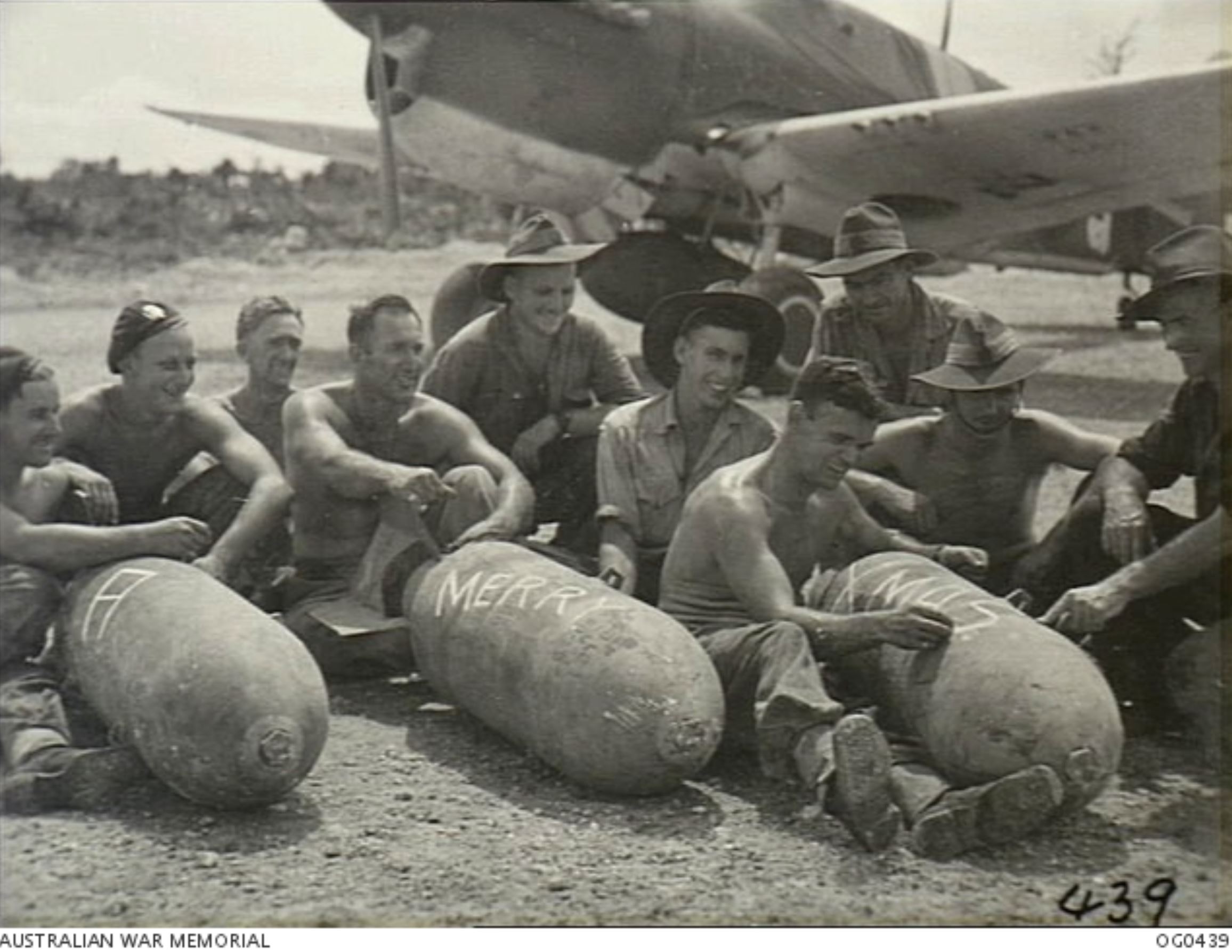 Aircrew RAAF 76Sqn group wishing the Japs a Merry Xmas at Kiriwina Trobriand Papua 26th Dec 1943 AWM OG0439