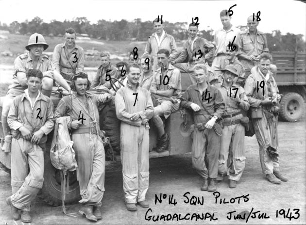 Aircrew RNZAF 14Sqn pilots with a Dodge weapons carrier grouped together after a patrol at Guadalcanal 02