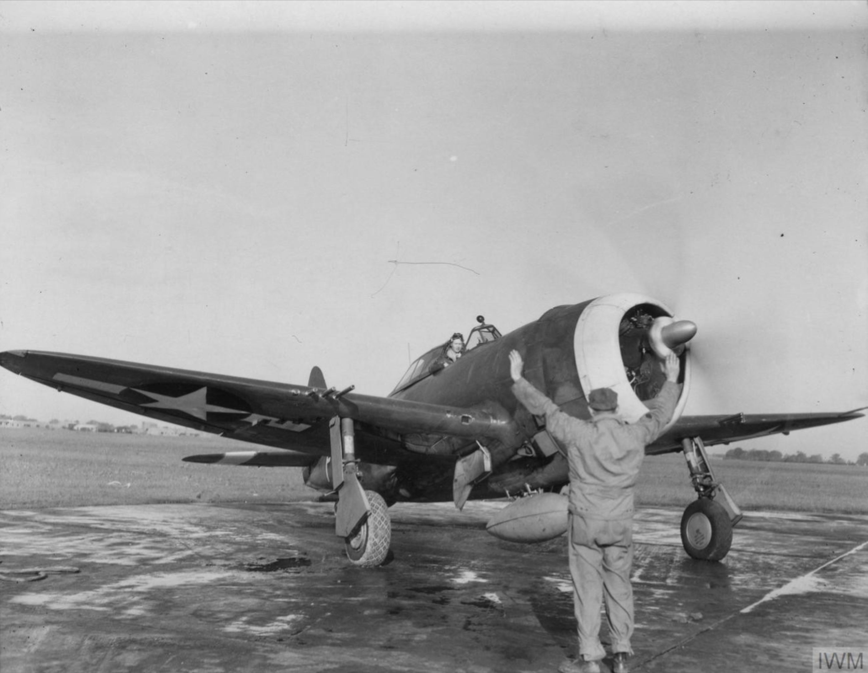 USAAF Republic P-47D Thunderbolts 353FG ground crewman assits 1Lt Tom Lobane to line up for take off at Metfield Oct 1943-FRE2817