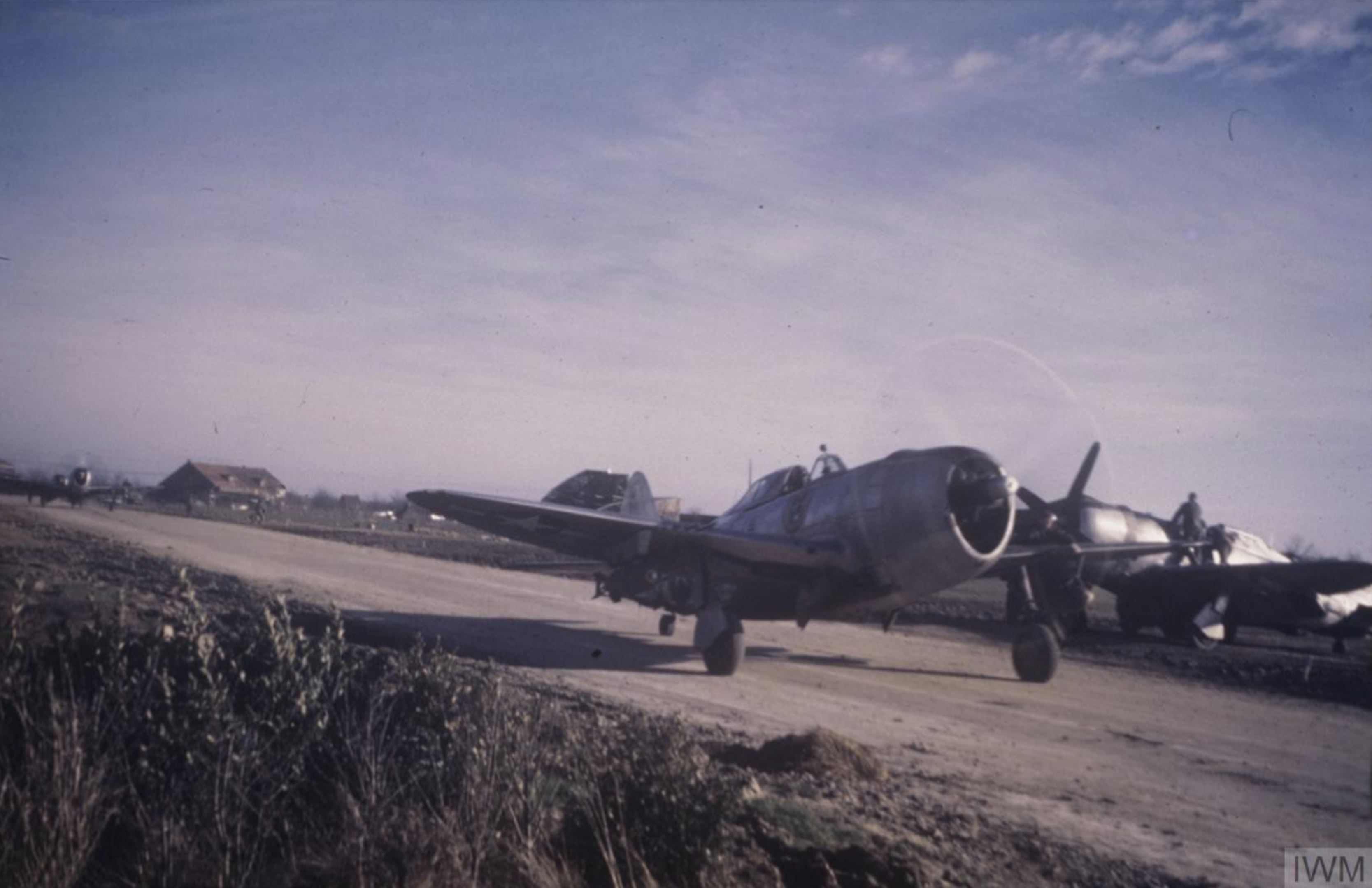 USAAF Republic P-47D Thunderbolts 404FG taxi along the ramp at St Trond before their next mission Feb 1945-FRE7368