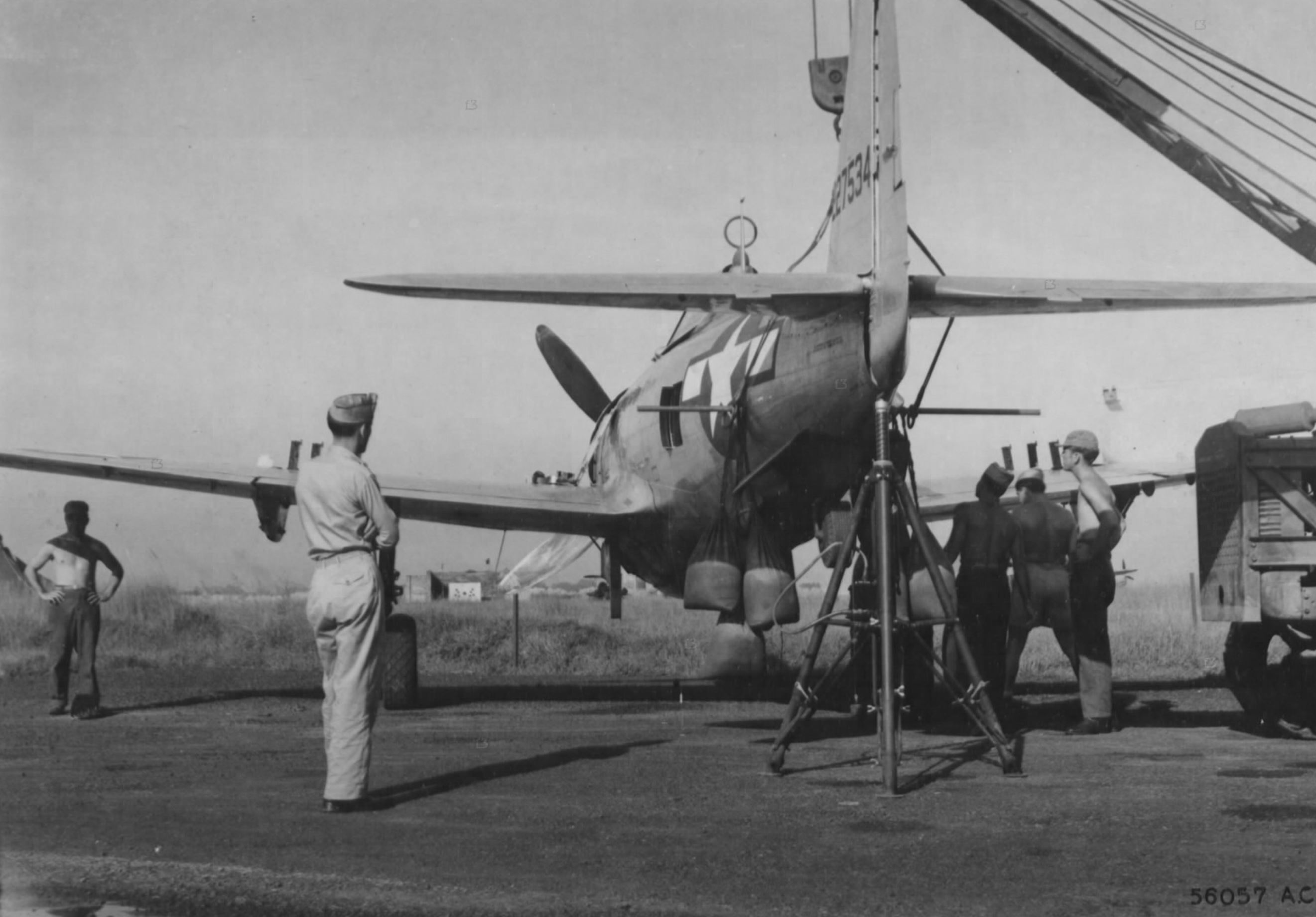 42-27534 P-47D Thunderbolt 1ACG is hoisted into bore sighting position India 1944-02