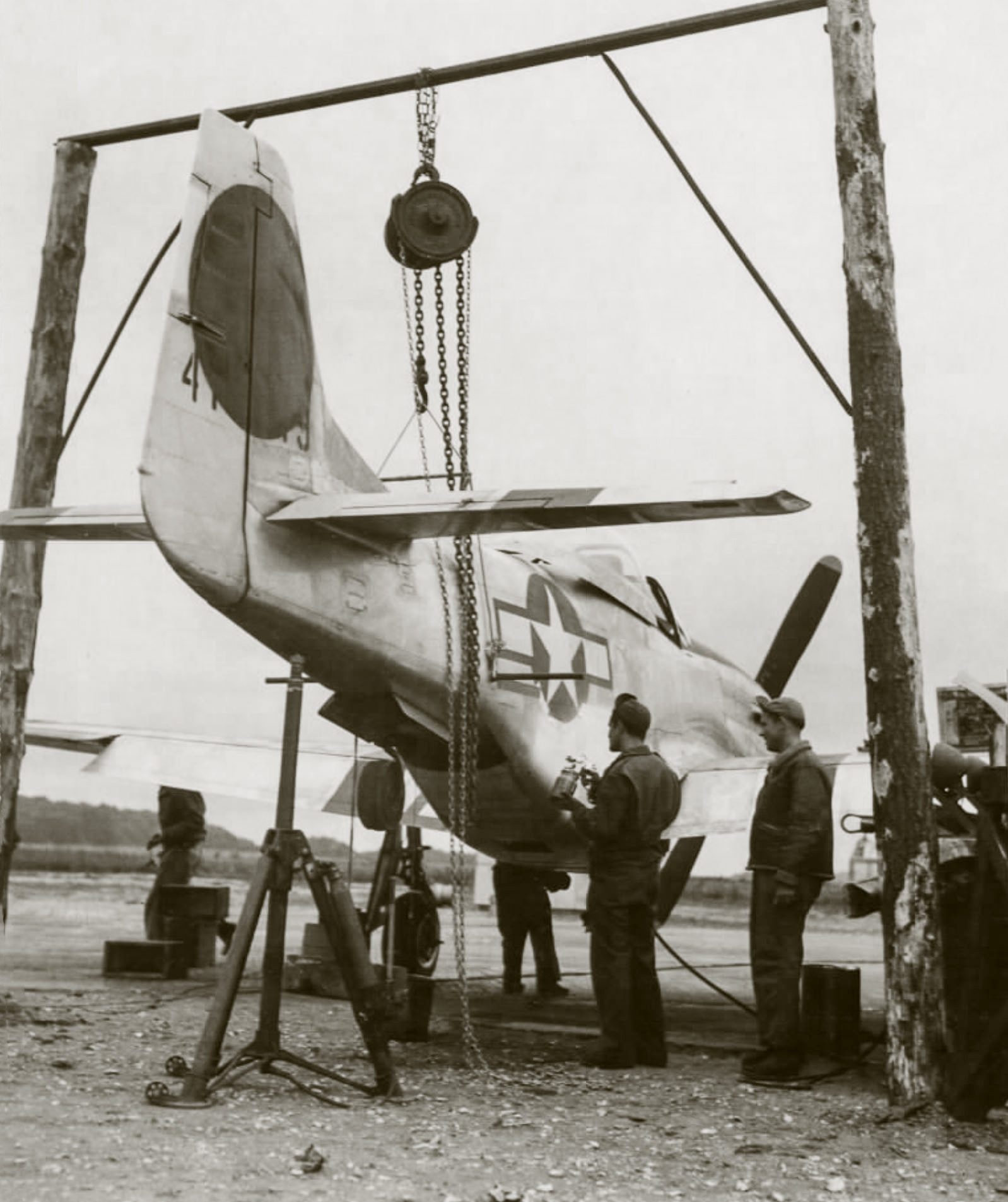 P-51D Mustang 364FG383FS newly arrived is slung up for bore sighting England 28th July 1944 01