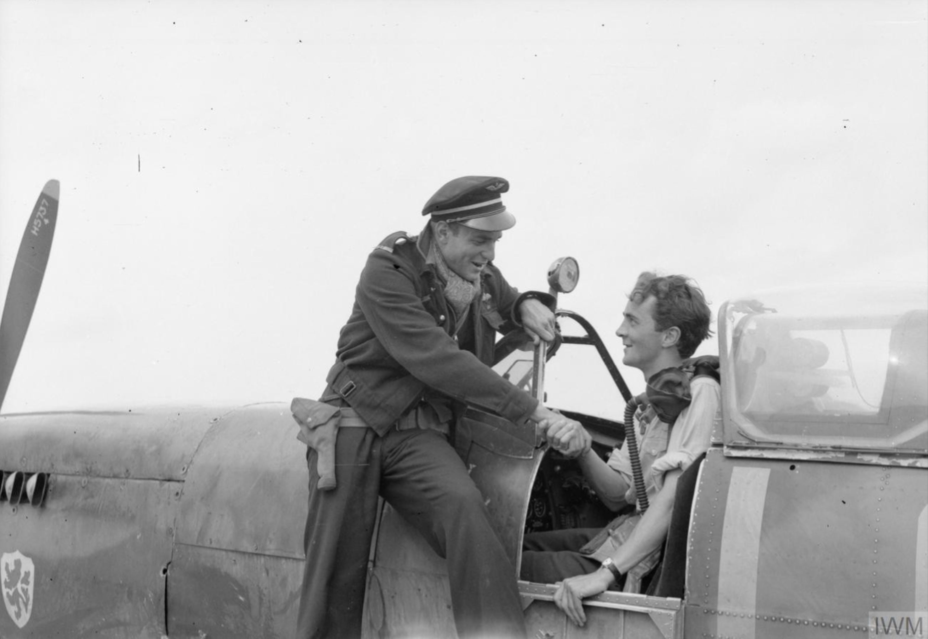Spitfire MkIXb RAF 602Sqn Pierre Closterman (L) KL Charney at B11 Longues Normandy IWM CL552